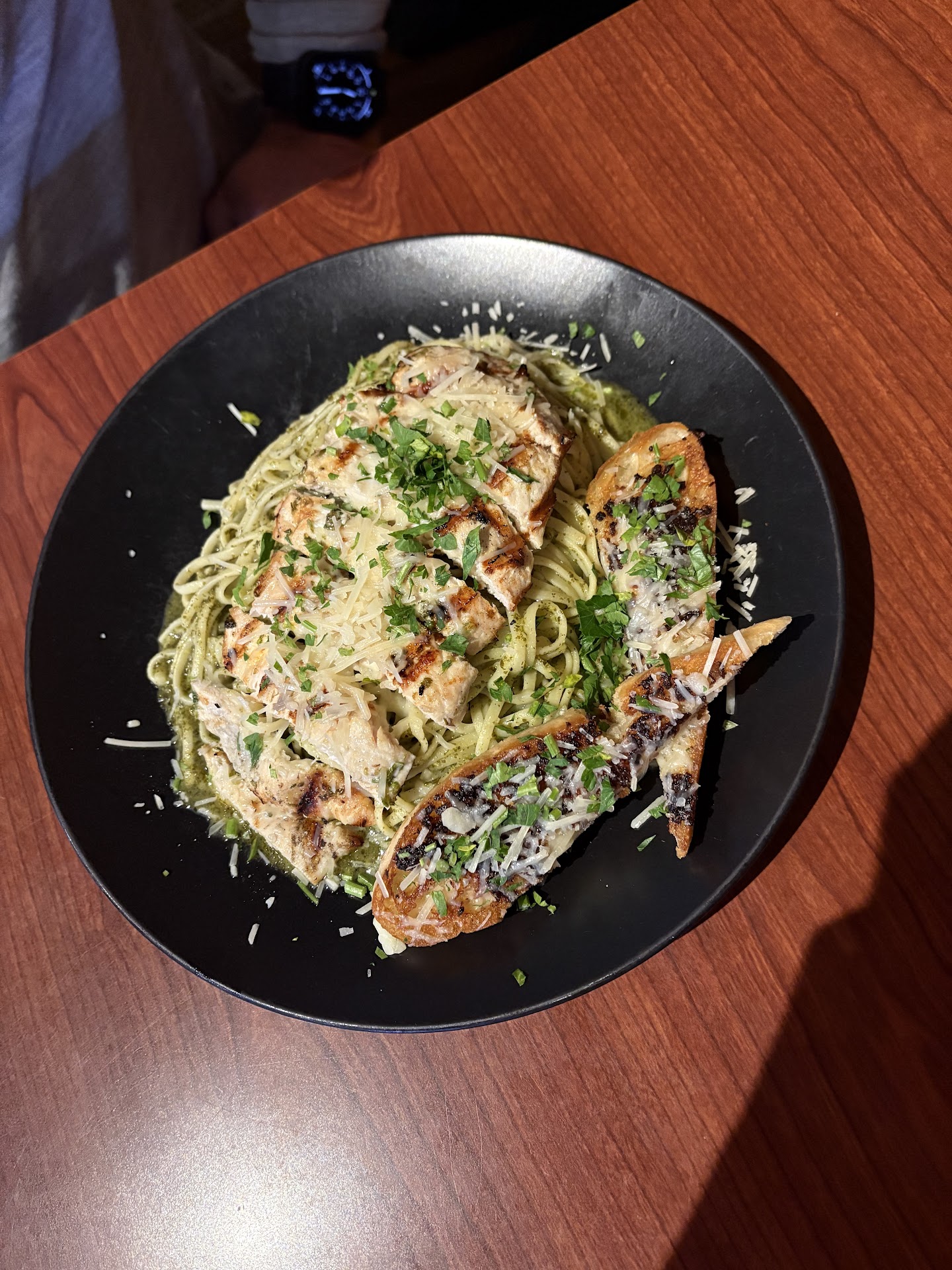 The rest is a generally NEGATIVE experience. It took an extended amount of time for our appetizer to get to us. Enough time that we had long since finished our drinks before it showed up and thought perhaps they had forgotten it and it might instead show up with our actual food order (which was taken shortly after our appetizer order was taken) Once the appetizer showed up I can genuinely say it was delicious and didn't disappoint. (We got the bacon gouda fries) We enjoyed it and waited for our food to show up...and waited... and waited... We watched people around us being served who had been seated after us and finally, A FULL HOUR after our appetizer was served, our food was brought out. We ordered two different burgers and a basic pasta dish. One burger was requested rare and was brought out medium well (ok, a bummer but not a huge deal)...the other burger was requested to be cooked well done with grilled onions. That Burger was served medium rare and was missing the grilled onions (this was a bigger issue). The chicken on the pasta was delicious but the noodles were cold and bland tasting - just the final straw in a disappointing dinner out. We had the noodle dish packed to go and brought it home to season and heat up to eat.