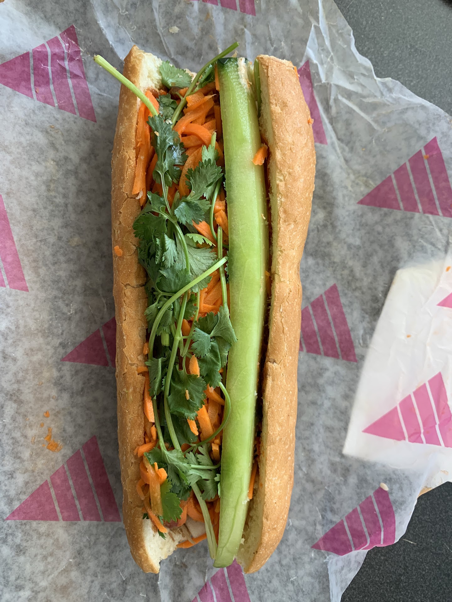 Read moreI wanted to like that sub so much because I spent $20 on a sub and a small smoothie. I thought I was giving myself a treat. I got the pulled pork sub medium spice. The things that were good with the sub were the bread and the cucumber. The meat, although it was fairly generous, did not have any flavor and was a really bad texture. Mushy. The sauce they put on the sub tasted like really really vinegar ketchup with maybe something else mixed in that was hard to pinpoint. I kept eating the sub trying to make it taste good but it didnât work. Like I said, I really wanted to like this sub. And then to add insult to injury, the sandwich is wrapped in paper, which I really like because itâs environmentally sound. I bought the sandwich and drink for my car trip, so I was eating it while Iâm driving. The paper wasnât wrapped very well around the end of the sub. And like I said itâs paper. so when I took a bite the sauce which they put a little too much of just gushed out the bottom of the sub and all over my pants. I was going to visit family and had to go with that all over my clothes. Also, they somehow wrapped the paper into the sandwich like in between the bread and the stuff inside and no matter how hard I tried to pull it out while I was driving, I was eating paper. Some of the time when I thought I was eating paper. And in some of the time it wasnât the paper it was just the really poorly textured pork that felt like paper in my mouth and didnât have a flavor. Like I said, I really wanted to like this sandwich and kept eating it. After a while, I just gave up because I kept having to pull stuff out of my mouth that was either paper or tasted like paper. The cilantro was not chopped. It was left in whole pieces, so there were these branches of cilantro that would pull out of the sandwich while trying to get a bite. And then after about an hour or so my stomach started really hurting. I think itâs because there was so much vinegar...