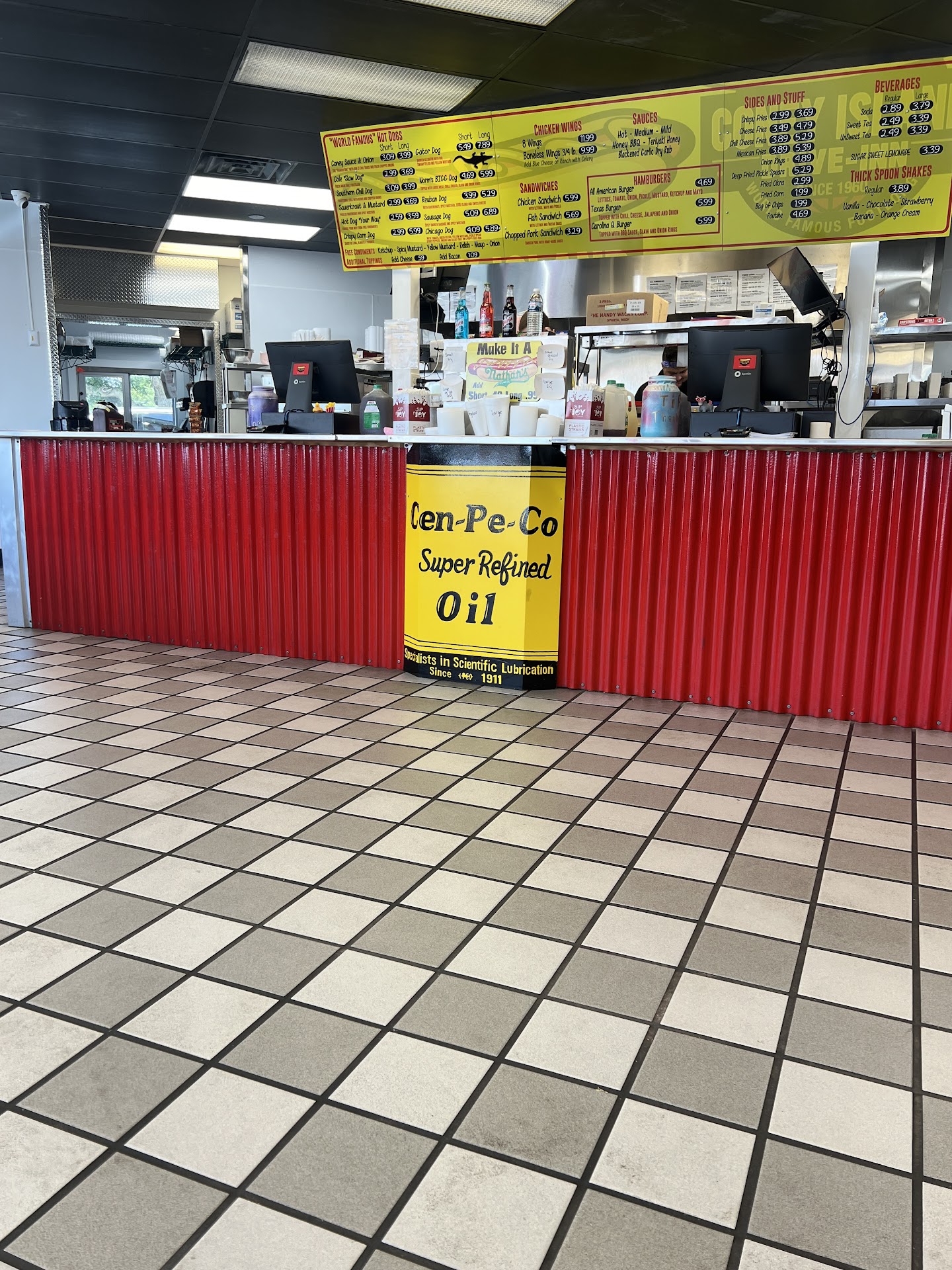 I was excited to try this as many people in the area have told Me it’s great. I’m guessing it depends on your definition of great and your expectations. For me and my husband we did not enjoy the food. Whatever oil they use for the fries and onion rings it’s not good. We orders a 6 inch and foot long hot dog. It was overcooked and super soft and had too much sauerkraut and relish making the bun soggy (not steamed like a traditional Coney Island dog). The hot dog was very disappointing as were the onion rings we didn’t like them and they went in the trash. The triangle fish on a bun was horrific! It was all breading and frozen and the presentation was sad. There is plenty of seating and they have a...