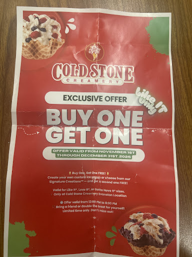 Read moreMy friends and I were having a joyous day. We were hankering for some ice cream. it was a really cold day, but we really wanted ice cream. So we put on our coats and headed out to cold stone. In freezing temperatures, we walked 30 miles with hope of ice cream in our hearts. We were really excited because on Big Bite Night (October 5) Cold Stone participated and handed out coupons (the picture attached) and samples. The man handing these out was friendly and we waited until the specified promotion start date of November 1st, 2025 to use this Buy One Get One Free coupon that specified it was applicable to all sizes (including Gotta Have It). However, little did we know… Upon our arrival, we stepped into the overly-heated establishment and felt the sweat dripped down our faces. However, we once again felt cold by the chilly attitude of the employee. We kindly asked with hope in our eyes about our buy one get one free coupon. the employee looked to the sky and pondered this coupon that we had presented in writing. she called her manager and spoke with him for at least 5 minutes, stranding us at the display case. When she returned, she proceeded to tell us that this coupon was not valid for the gotta have it size. We were bewildered, dismayed, and besmirched. We questioned this as we had the deal and its various details in writing. When we questioned her about this, as the Gotta Have It was clearly included, she went back and called her manager once again, for even longer this time. When she returned, she told us the entire offer had expired because it was from their grand opening. False! She claimed it was 2-3 months ago; yet, we were there when management changed at least 7 months prior. We were disturbed by this facetious behavior and stated that the coupon clearly has a start date that is this month and we got this coupon at Big Bite Night the month prior. As we continued our intellectual debate over the binding agreement within the coupon, she went on to claim that only one coupon/promotion is viable at once. She proceeded to hand us another coupon with the BOGO offer that expired on 10/31. Her argument was illogical, flawed, discombobulating, and plain BULLSHIT.