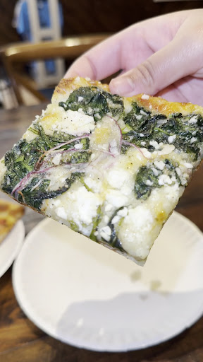 We tried the Green Dreams pizza, the Rabbit (veggie) slice, a Detroit Square, the seasonal salad, the seasonal vegetables, and the garlic knots. The seasonal salad was crisp and refreshing, and the seasonal vegetables were roasted perfectly with this creamy aioli that just brought everything together—such a good combo. The pizzas were absolutely delicious, and my favorite was the Detroit-style pie—crispy edges, cheesy, and just the right amount of sauce. You can really taste the freshness in the dough and toppings. And the garlic knots? Next level—soft, flavorful, and honestly, some of the best I’ve had.