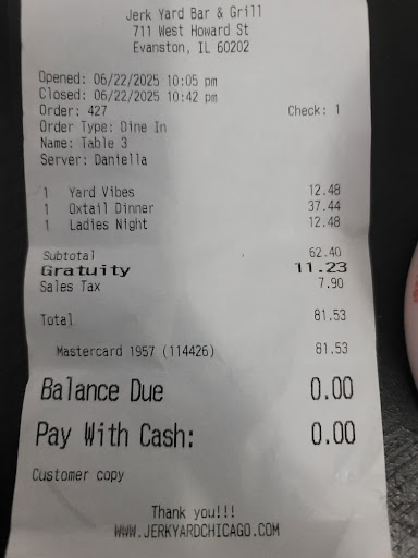Read moreWent here for takeout. Not hectic service so that’s a plus. Sat at the bar and waited no issues. Ordered two jerk wing dinners. The wings were huge and well seasoned. That’s all I liked about the meal. My cabbage tasted off it was good texture and all but it was a spice or something in it I wasn’t used to and it threw me off. The rice and peas were dry but the peas were packed with flavor so it balanced the rice out I would recommend a splash or two more of coconut milk. The plaintains were good I did like those too. However it came with no sauce not a drop not a cup not a dab so everything was dry. Also no bread slice. The menu doesn’t scream authentic yard born but it’s a nice revamp if ure into the less traditional things like Rasta pasta and egg rolls. Oh and they didn’t have...