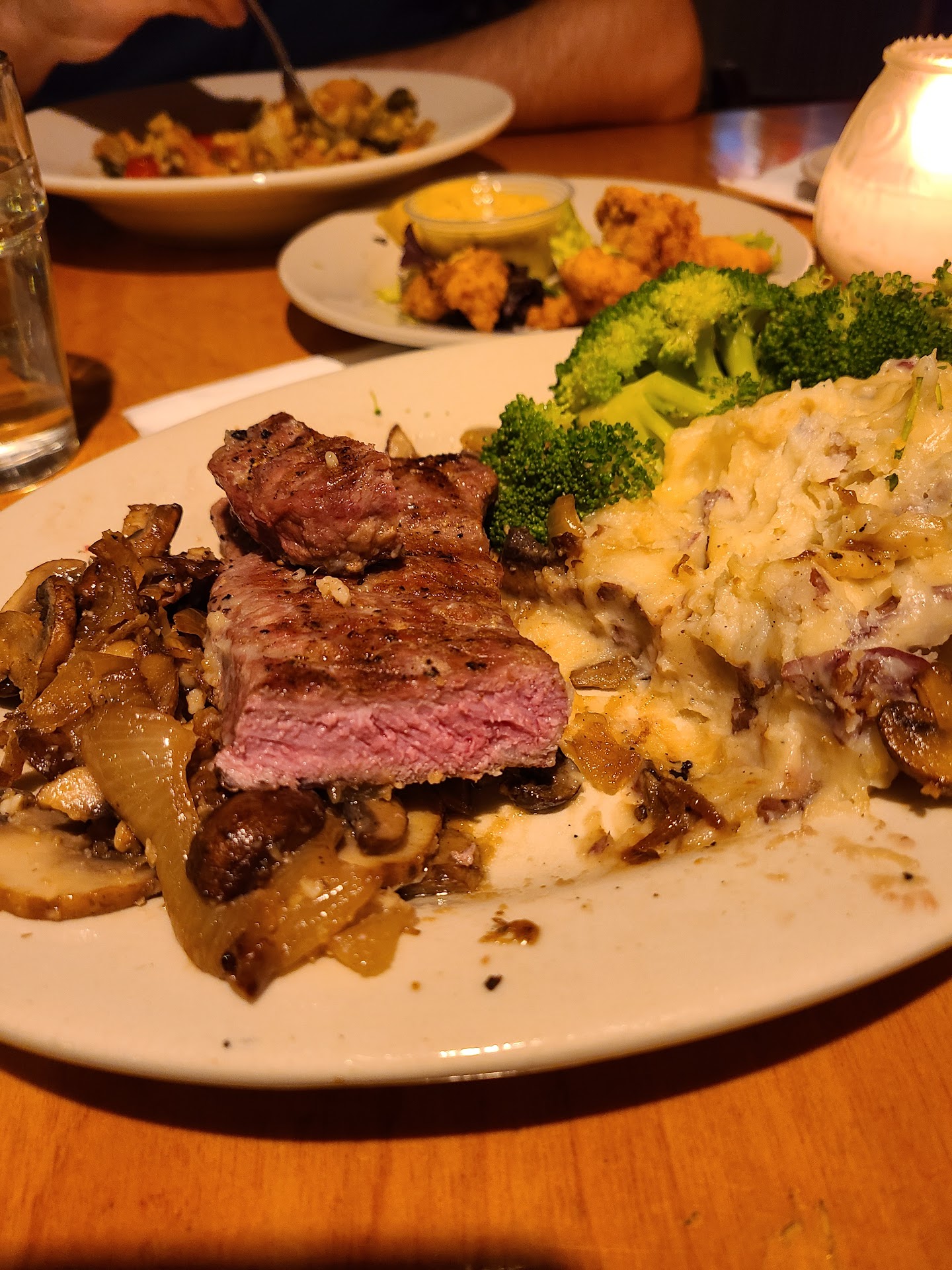 Read moreThis is something like my 2nd or 3rd ever review, but it felt necessary. These pictures are from my second, pretty disappointing visit to Prairie Moon with my boyfriend. Last time, a few weeks ago on a Thursday night, I ordered the pot roast with root vegetables, and the roast was incredibly dry and reminded me of a frozen TV dinner, while the vegetables were diced pretty small and cooked to the point of being crouton-like. But my boyfriend enjoyed his fish and draft beer, and yesterday was his birthday and he wanted to go back to Prairie Moon. This time I ordered the NY Strip Steak with mashed potatoes and broccoli, I ordered the steak medium-rare. These pictures are from the opposite ends of the steak. I don't even know what to say. In addition to the one side being basically raw, it was also almost completely unseasoned and dry. The potatoes were fine and the broccoli average. We also ordered the Cajun catfish nuggets for an appetizer and those were pretty good and again my boyfriend enjoyed his order of the 3 Sisters and beer. The service was fine, but both times we had to flag down the server to get our check after waiting 10-15 minutes after our plates had been cleared, so we could catch the bus home, and it's not like either time the restaurant/bar had more than 5-7 tables. My boyfriend and I enjoyed the atmosphere and he enjoyed his meals (admittedly he is a lot easier to please with food than I am) and the drinks, but I have yet to find a meal I really enjoyed...