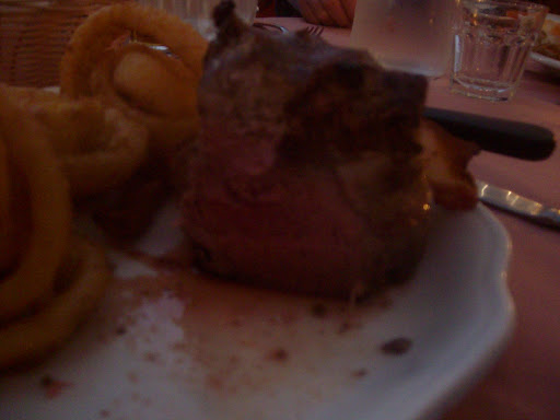 When you sit down at your table, your drink order is taken. They have beer, wine, and a good selection of harder liquors. Soon after, your server brings out a cold veggie tray. Your meal is then served in courses, starting with whatever appetizers you order, then a small bowl of French onion soup, a dinner salad (of spring greens, not iceberg lettuce, and the piece of buffalo mozzarella is a nice touch), then your main course. All the above, except for specific appetizers, is included in the price of your meal. And oh, my Lord, you'd better be hungry by the time that's served! I ordered a "petit" filet mignon, and as you can see, the thing had to be 2+ inches thick. It was prepared just the way I like it, and was perfectly seasoned and juicy. Our friends had the steak and crab legs and as you can see from the photo, the portion of the latter was huge. At the end of the meal, we all had to-go boxes. After the main course, you get a small dessert of a sugar and cinnamon mini-croissant.