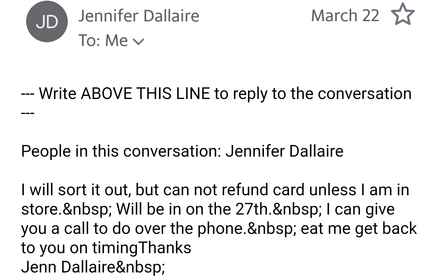 We got old and overcooked pretzels here and we were overcharged. Charged for the nuggets instead of pretzel. Caught the error and they claimed they corrected it and refunded us and charged us again the correct amount. Well the refund for the first transaction never came up on my credit card. I reached out to them and Jennifer Dallaire responded to me. Assuming she's a manager. She claimed she would call me to refund me March 27th but never did. I reached out to remind her but she never responded. It's now April 21st. So, I take it she never had any plan to refund me even though she knows we were charged twice. I think it's really bad business to overcharge your customers, lie to them, and ignore them when you owe them money. Posting a photo of the last email Jennifer sent for proof. PS. Nobody wants those pretzel nuggets cause they've been sitting...