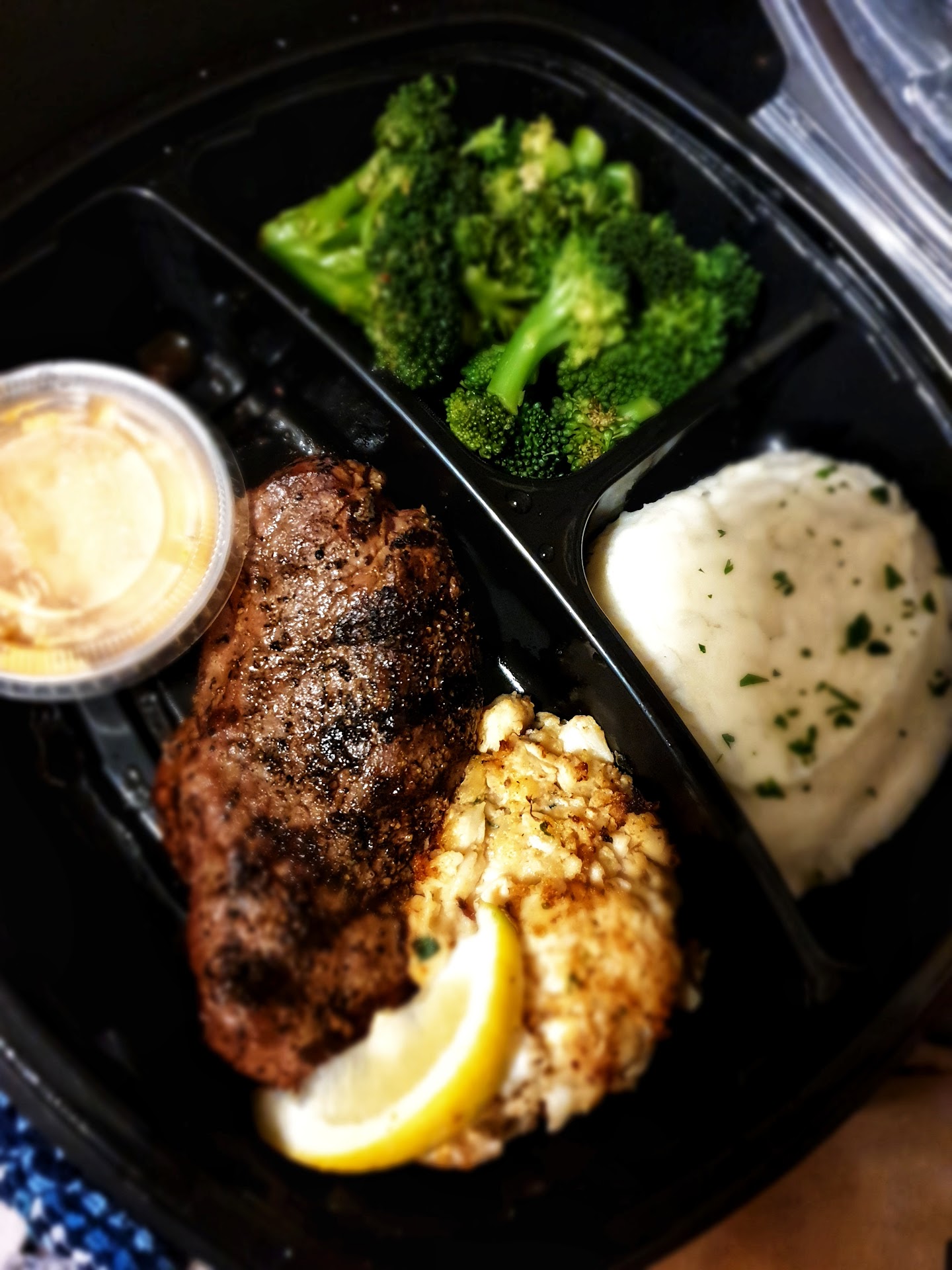 Read moreThis was a to go order for curbside. This is the first time we have had Bonefish. We ordered several different things which include Imperial Dip with chips, Beef & Ginger dumplings, 7 ounce Sirloin and Crab cake with garlic potatoes and seasonal vegetables (which was broccoli) , Cod entree with garlic mashed potatoes and spinach along with a cesar salad and bread with olive oil dip. The imperial dip was alright not my favorite but I am not a huge shrimp person. The chips were good that came with it I believe it said they were made in-house. The dumplings were good I'd get them again. They tasted good with all the toppings on top. The steak and crab cake was good. I ordered the steak mid rare and it was perfectly mid rare and very nice you didn't need sauce at all. The crab cake was good as well and didn't taste fishy at all. The potatoes and broccoli were good, the broccoli wasn't overdone at all. The cod unfortunately was dry but still edible. The garlic potatoes were good as well and the spinach was alright. The salad was just that a salad. The bread which was free was good.