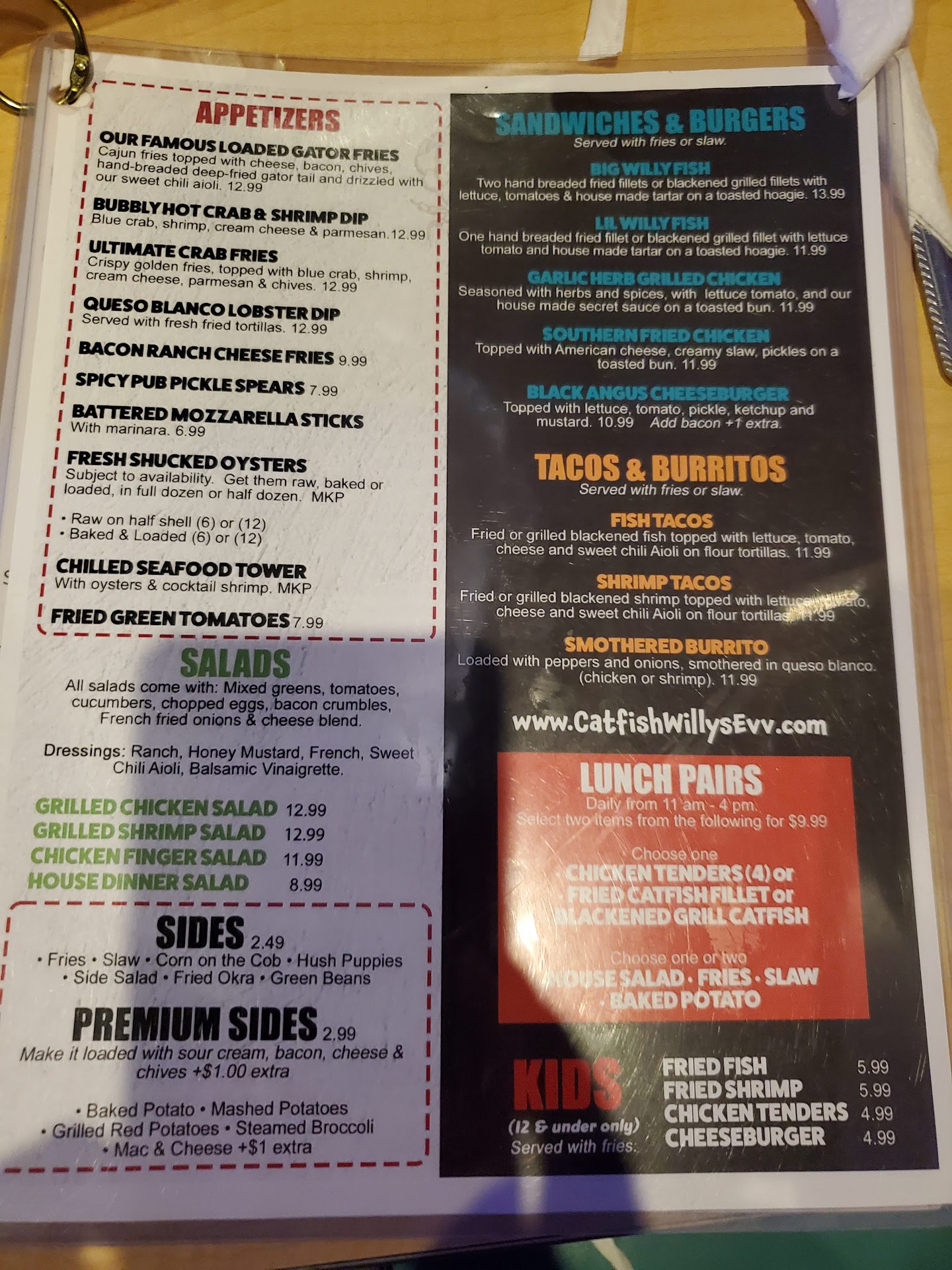 Read moreRestaurant Review Catfish Willy's Evansville. This is my comment I posted to their site which I am sure will be deleted as soon as they see it. Avoid their All You Can Eat Catfish Special!! Our party consisted of 4 people, my wife, brother in law, sister in law and myself. Arrival 5:15pm Saturday July 29, the place had several guest but was not crowded and no wait seating was available. All 4 of us ordered the all you can eat catfish special, a bit pricey at $19.99 each but hey it was all you can eat catfish and sides. After 30 minute wait on food our first round consisted of two slivers of fish looks like they had cut a standard size fillet in at least 3 if not 4 pieces and one side. Their side choices for their all you can eat are fries, hush puppies, and cold slaw. You can switch sides between orders but you can only get one at a time. So our first serving was far from a standard catfish dinner, but it is all you can eat, right? So I asked the waitress to put in our next order immediately since the initial order took so long which she did. Needless to say all four of us finished our meager first serving in less that 5 minutes, and then waited 20 minutes for our second order of fish to arrive, the same slim servings as the first but with no sides. We were informed we had to put in orders for fish and sides separately. We put in another order for fish immediately. We finished our second order of fish long before or second order of sides appeared and finished these long before our third order of fish appeared. The pattern continues for a full two hours with me complaining to the waitress all the while before our friends said they had had enough and were ready to leave. All total we received less food than a standard fish dinner at Cheddars or Sam's Southern Eatery. No offer to reduce bill, no manager to talk to, and no comment cards. We will...
