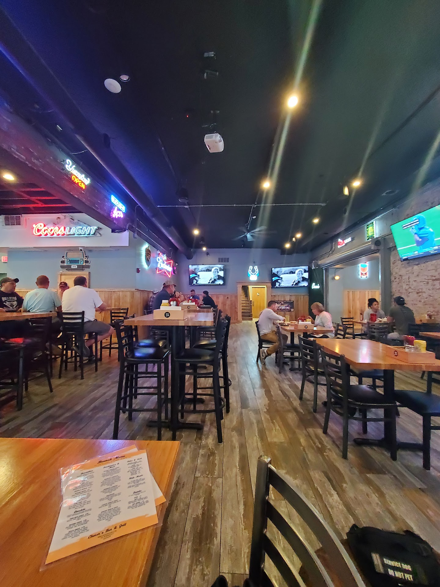 We have never been to Chasers before and I will say it's a very nice looking establishment on the outside and inside. We went around 1:15pm on a Saturday afternoon. We originally sat in the first dining/bar area, (bar on the right upon entering) but I saw the additional room on the left that looked a little more inviting. We chose to sit at table 32. It was a little busy & after sitting for a few minutes I decided to go to the bar and see if we were going to expect a server or if we needed to order at the bar? There were 3 young ladies working and as a past food industry employee, I completely understand. Two young ladies stepped in front of me and said, "sorry, we need to talk to the bartender about our check." Ok...I understand. Another bartender approached the area and asked if the other bartender needed help with anything. She saw me and asked if I needed anything. I asked if we had a server in our area and she said she would be right with us. She showed up at our table within a minute gave us 1 regular menu & 2 brunch menus. She started with our drink order..(dt coke w/lemons and a Dr. Pepper) & I ordered the, "Bang Bang Shrimp" Appetizer. As our entrees, my husband ordered the fried pork tenderloin w/waffle fries & I ordered the, "Spicy Cowboy Bacon Burger" no bun (I eat very low carb) & unfortunately, all they offer as a "low carb" option for a side item is cottage cheese. I also asked her if it was very hot 🔥 as I love spicy, but I didn't want too hot. She said I could get the fried jalapeños on the side to adjust the heat if I needed to. Our server was very nice and apologized for any service confusion, as they were training a new employee. The Bang Bang Shrimp came out in less than ten minutes. It was very good! Excellent flavors and nice/simple plating on a top of iceberg lettuce shreds. The entrees arrived, my husband's looked very good and of course, mine didn't look as appealing as I had my order altered, but I was still optimistic about it. Now, if you live in the Midwest especially Evansville, you KNOW your tenderloins and my husband is one of those people. He took a bite of a waffle fry and CRUNCH! It sounded like a potato chip and he didn't eat another one after that (very overcooked). I cut a piece of my burger and had a bite. First of all, the burger was extremely overcooked, dry, and overly salted. The bacon was cooked very well and the cottage cheese was good. My husband's tenderloin however was anything but good. It had a bit of juiceness to it and thickness, BUT zero flavor. At the end of it all we spent $50 on sub-par bar food. Our server, obviously expecting, was very sweet and precise. I don't believe we'll be back for lunch, but as inviting as the environment is, I would like to come back for drinks and...