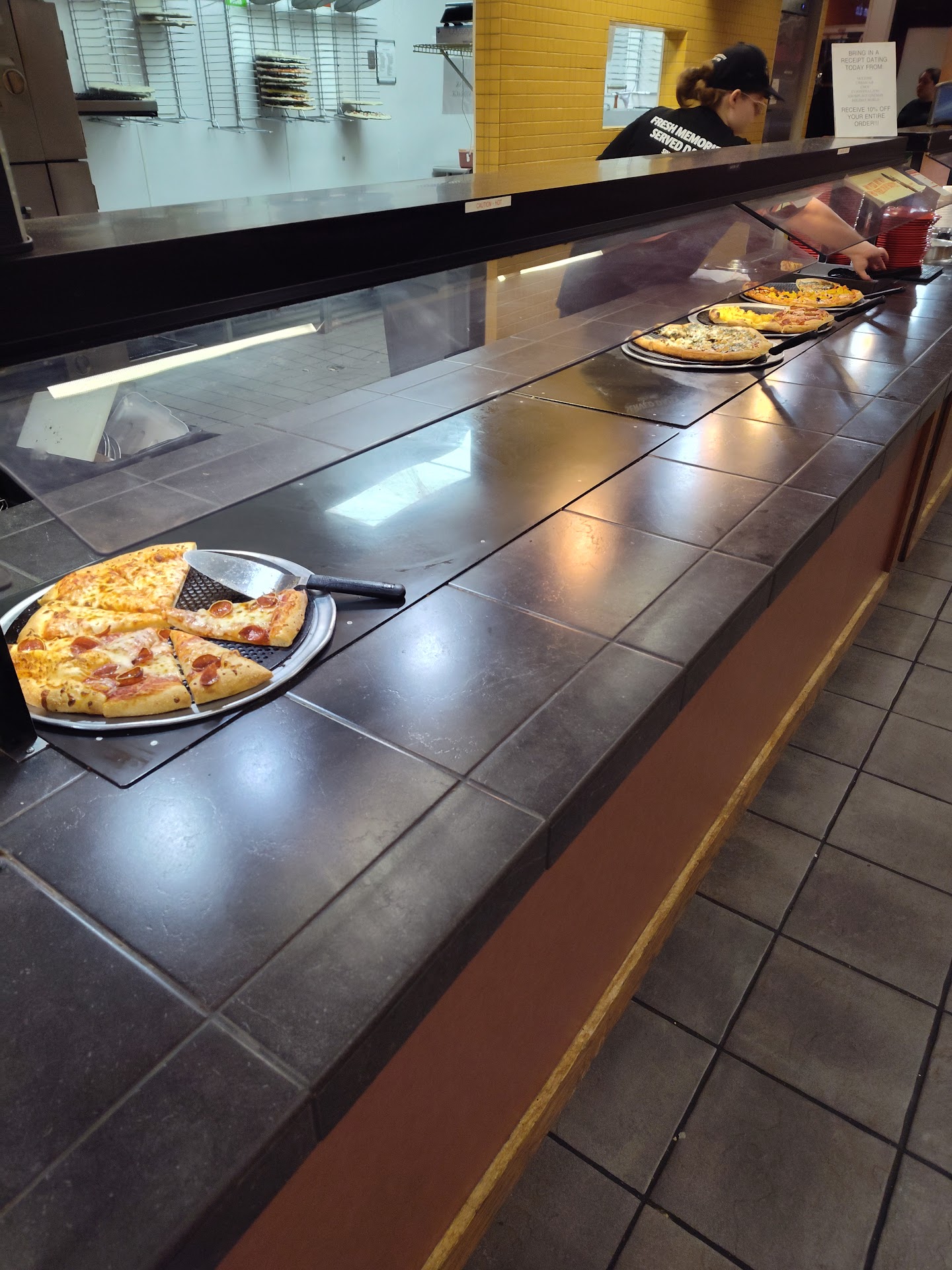 Read moreLily was cashier she smiled when I walked in and was such a sweet lady. When I asked about senior discount She said she hated to ask if I was old enough for senior discount she said I didn't look that old when i told her yes I'm 57. But she gave me the meal for $3.99 buffet. I believe it is a internet coupon. I told her thank you very much. That at regular price I was short by 50cents. Pizzas all looked good. I got small Salad with banana peppers and pickles. Of course banana peppers were for pizza. I got a few thick breaded pizzas slices. And a bowl of extra sauce. Only problem is I couldn't eat all of it. I have to take most bread off pizzas due to gastric bypass and can't have that much bread. But I could bearly eat one piece even with added toppings from other slices. Just wish my stomach was as big as my eyes.. the tables were clean and when I asked Lily told me where the knives were . I don't eat out much when I go to Evansville Indiana but every now & again. Other employees that I had contact with were nice and smiling. Thank you Lily for allowing me to enjoy some good...