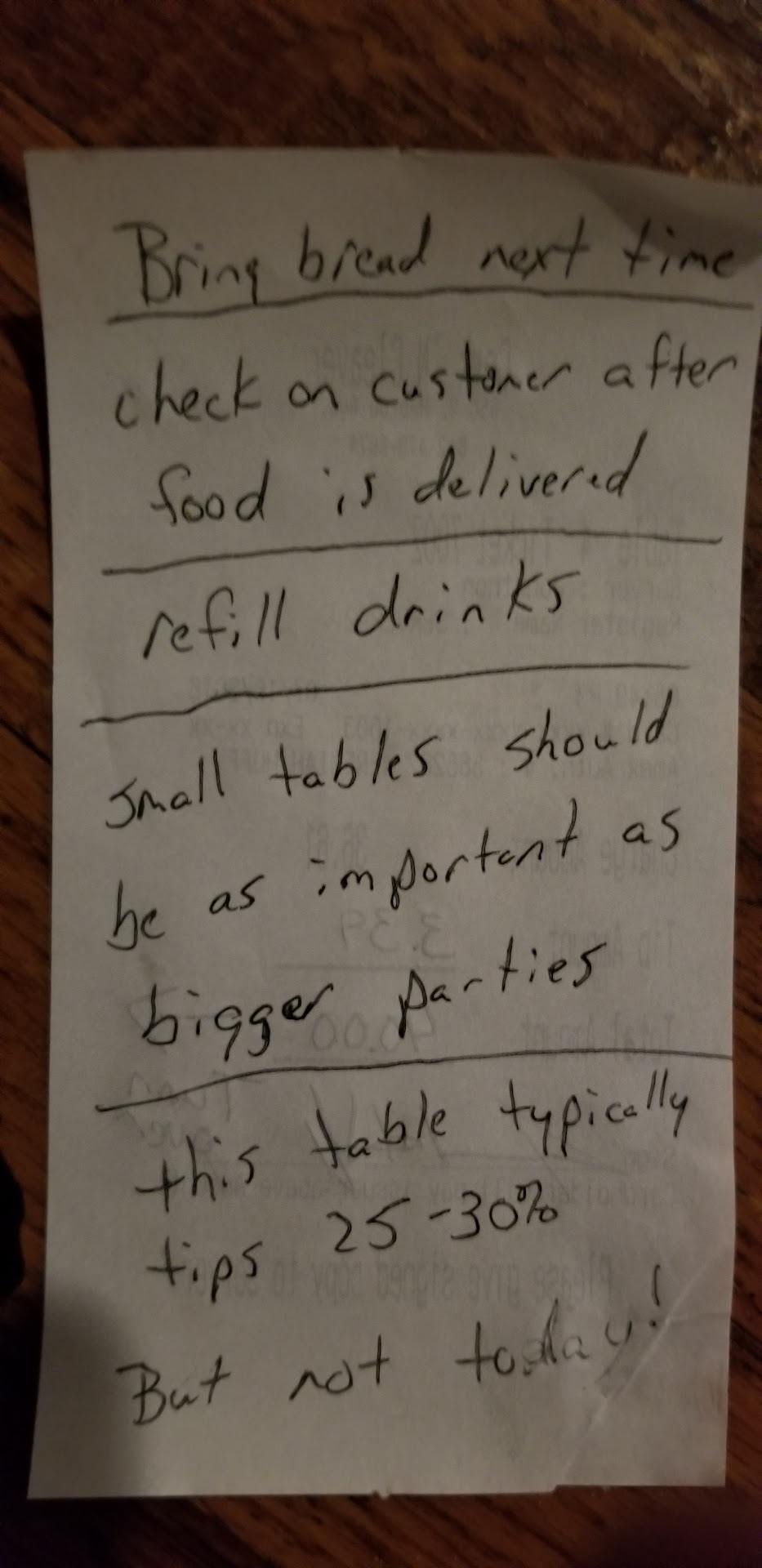 We normally don't leave these type of reviews, but last nights dining out left a bad taste in our mouth to say the least. I've never had Cork 'n Cleaver so my wife and I decided to try it on a Monday evening around 5:15. The host seated us as soon as we walked in the door. That is about where the positives ended. We waited for our server to acknowledge us for almost five minutes. We were handed a cleaver with only the partial menu printed on it. We had to ask for different menu options. John, the waiter, was very brief and inattentive. He said he would be back out with bread to go ahead and help ourselves to the salad bar. John never returned with bread the entire meal. Our prime rib dinner was served by someone else and we never heard from John. Potato had a large black knot in the center of it. The 8 oz. Prime Rib was a sliver of a piece of meat, if I'm being generous. No one checked to see if the food was correct, tasted alright, anything. We were drinking water. John walked by one time to refill my glass. I drink water. I was empty quickly. After we got our food from the salad bar, we watched the salad bar attendant refilling the bar from bulk factory containers right on top of the old food. Cottage cheese spooned straight from the original container on top of the cottage cheese that had already been sitting out on the salad bar. At least take it to the back and refill the container with new on bottom and older on top. No telling how long the original cottage cheese had been sitting on bottom. At the end of the meal, John comes back to the table and apologizes for not getting back to use. He said he was busy with a bigger party and hands us our check. He was too busy to check on us the entire dinner, but was not too busy to stand over us and wait for us to hand him our payment, tip and signature. I know my measly $40 dinner does not contribute at all to your bottom dollar, but we work hard for our money the same as you do. We expect good food and quality service when we go out to eat. We expect something a little extra and a little more when dining out and I'm paying someone else generously to do that. That.......was not even close to what we received at Cork 'n Cleaver. I left our constructive feedback written on the back of our receipt, so when the manager runs the numbers for the evening and John complains about his tip, he...