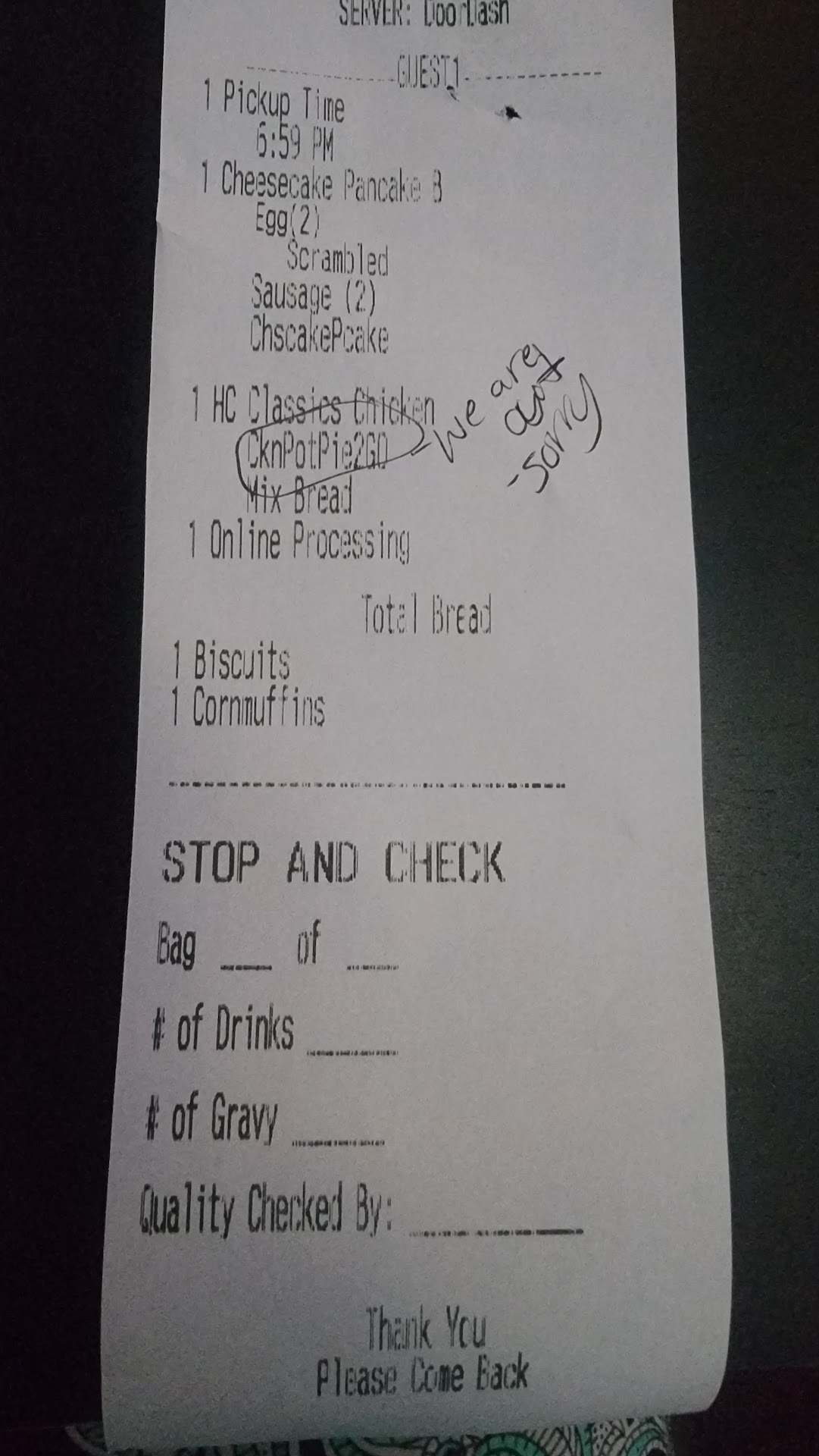 Read moreOh my folks, i hate giving bad reviews. The service (delivery) and treatment by the individual alleging to be a manager at this restaurant were reprehensible. 21 years of military service, im in town for medical procedure. My husband and I ordered food from this establishment. We didn't realize that online at the cracker barrel website, when you have food delivered as a guest, the food is delivered by door dash and if there are any problems, you may be out of luck. The money charged for both meals was at or about $86.00 dollars. When the food arrived, 3 items were missing, the gravy wasn't cooked long enough and tasted like flour, the brown gravy was overcooked, the macaroni was dry, the chicken was chewy and not cooked to order. We called the store and spoke with one manager who refused to discuss the matter and hung the phone up while we were talking. Before disconnecting the call, the individual who will rename unamed told us to contact the door Dash. We called Door Dash, who advised us to call Cracker Barrel again! We called Cracker Barrel again and spoke with a manager who said he would call us back after he looked into the situation. He called back and said he would credit our account $35.00, which HE STATED was very gracious. VERY GRACIOUS, he also suggestedwe come to the restaurantto have the order replaced??? Folks, due to disabilities/medical reasons, we could not drive to the restaurant from our hotel room to have the order replaced. We explained this but it fell on deaf ears.. I can't understand this type of treatment. Hard earned money spent at an establishment that we thought would be great. I would not recommend this...