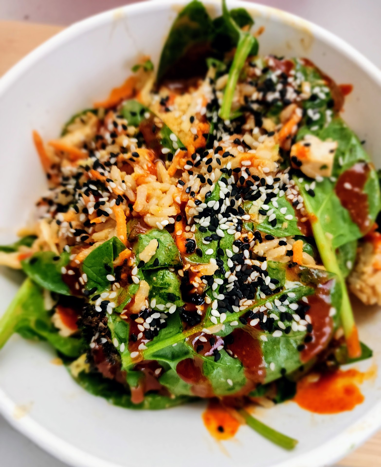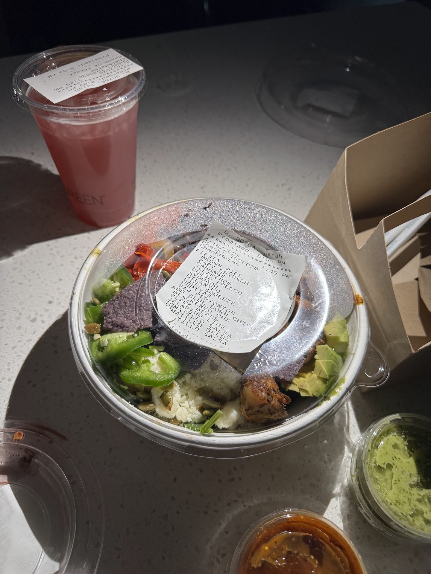 Presentation is funny because they begin by putting all the ingredients you order on top in a more aesthetic fashion, but then once you get down to the end of the line, they add dressing and just toss it all together where it looks like a salad that someone had already been eating off of. It’s a salad place so I’m not expecting fine dining level plating (duh), but it makes no sense to do it this way. Either add the dressing to the greens at the start, add toppings neatly on top, and then allow the customer to mix/toss, or just give the customer their dressing on the side in a cup and let them pour it over the neatly laid out toppings and they can mix. Again, seems funny to critique but I’m using Cava/other higher end salad places as a bar setter and it simply looked unappetizing by the time I paid for it and walked to my table.