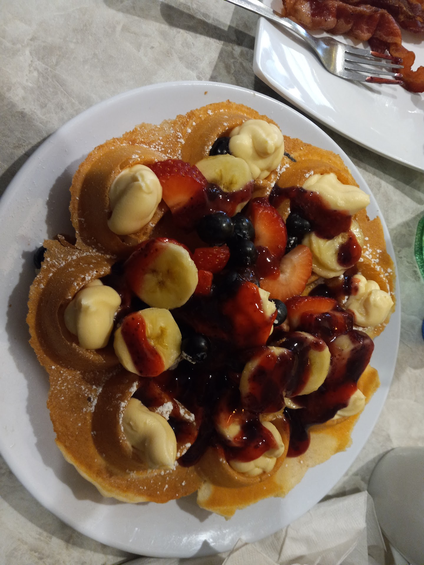 Normally, this place would've received 5 stars across the board, but this visit was horrible. My husband and I go there all the time, and we drove 1 and a half hours from Kentucky, to go to breakfast here because it's ALWAYS been our favorite breakfast place. We ordered coffee and my husband asked for honey for his, which he always gets/uses for his coffee. The waitress said that will be $1.00 extra. (That was a first!) Anyway, I ALWAYS get their "Very Berry Stuffed Waffle" and bacon. My husband got an omelette, and asked for german potatoes (home fries with onion), instead of the hashbrowns as he always does. The waitress again said, that will be $1.00 extra, (another first). My husband declined and said just give me the hashbrowns. The foid came and after 2 bites, I discovered that there was a 1 inch sliver of plastic cooked into my waffle (a piece of the black plastic is visible in the top right-of-center of the picture, but I hadn't noticed it at first, or I would have sent the food back immediately). When I told the waitress she took the plastic, but was about to leave the waffle. I stopped her and told her that I wasn't going to eat the waffle after finding a foreign substance in it. She then took it, came back said she told the owner, and brought me a menu to order something else. I then ordered egg whites with cheese, hash browns, bacon, and wheat toast. When THIS order came there was no cheese on the egg whites, and there was something that looked like mustard smeared on the toast. My husband tasted it and said he didn't know WHAT it was, but said that it was gritty. (He's bolder than me, because I wasn't ABOUT to taste it.) I again called the waitress over and told her about it and the missing cheese from my egg whites. She insisted that it WAS butter. I gave the toast to her, ate the potatoes and bacon. She later came back and said that the "stuff" on the toast wasn't butter, but she didnt elaborate. She then brought us a check for $27+. My husband paid the bill anyway. With all the money we have spent here over the years, I would have expected them to comp our meal, and apologize. But we got neither. Needless to say, we won't be going back! It's a shame too because it USED TO BE our favorite breakfast place!...