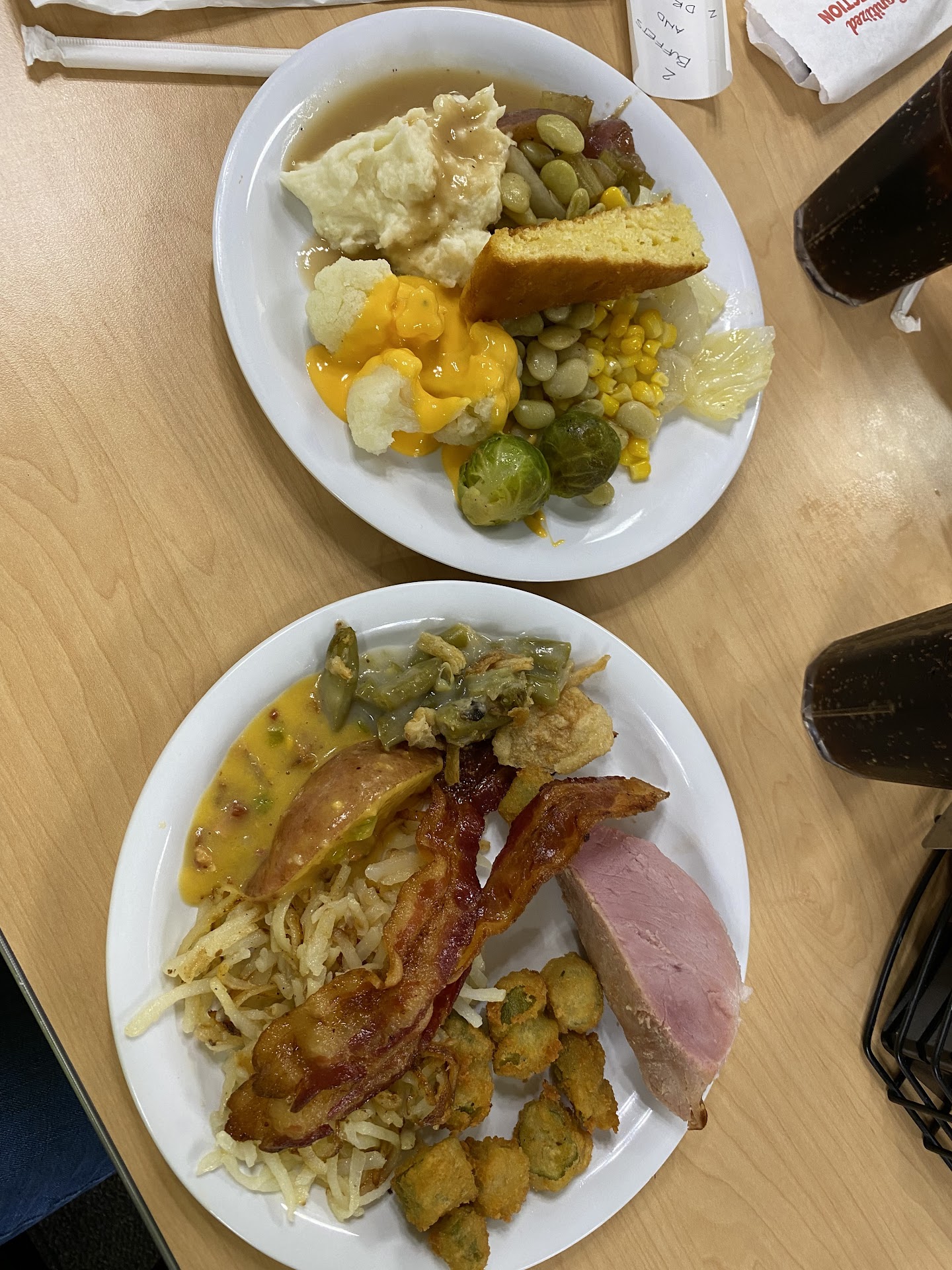 Read moreIt was okay. My 11 year old is not picky but he found a hard time finding anything he liked. This one didnt seen to kid friendly. They had these steak burgers but he took a bite and spit it out opened it up it was black and very hard. He tried again but same. Tue pizza was ok he said. Taco meat was spicy so he wouldnt eat tacos. My husband said the steak was pretty fatty and tough to eat. He liked the chicken and the pulled pork. And of course the rolls are always good. I went to put melted cheese on cauliflower and it was a pan looked like oil setting on top of some yellow stuff didnt try it. The roast was very good. Very tender. The chicken was also very juicy and very good. The salad bar and fruit was fresh and very good. Cookies and cakes were extremely dry and cookies over cooked big time to couldnt break those apart. Bread pudding was very good. Cobblers were empty so couldnt try those. I love carrot cake that was not carrot cake. Blaa. Service was great waitress was super friendly. Always ahead on our drinks and picking up plates. She did a great job. Cooks on the other hand either a bad night or they need some new cooks. It was ok overall wouldnt probably go back but we were traveling and it seem to have...
