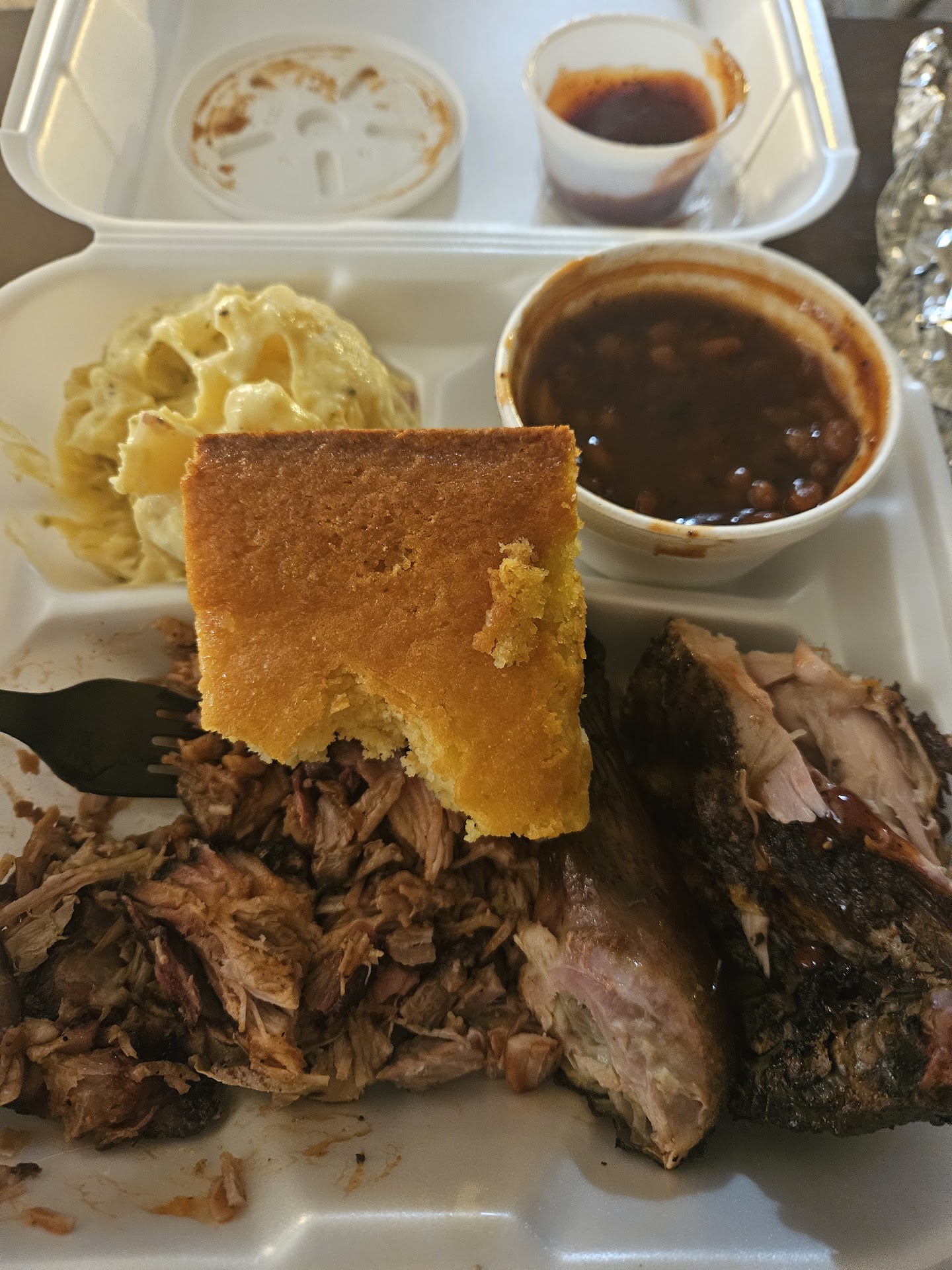 Read moreI came in by myself, waited in line for several minutes which was okay, shows they have good business. Ordered sat down. Gentleman brought me my food. I noticed I didn't have the extra cup of sauce that I purchased (which is a little high for that small cup but not extremely) I went to the counter and asked for it, they gave it to me, didn't seem to happy. The food was okay, not a moderate portion of pork, the bbq beans was the best part. As I was almost done eating I realized they didn't give me my cornbread that came with the meal, as I looked around I saw other tables with cornbread and at that very moment I realized I just became the one character in the Movie Life that asked Martin Lawrence character if he was going to eat his cornbread, but unlike Martin Lawrence character I didn't get my cornbread. Will I come here again probaly not unless it's just for the beans again the beans are good. But for a restraunt that's begging for customers shouldn't be forgetting customers food that they paid for. I wasn't going to go back up there a second time and ask them for something they should of already brought me when the first time I went up there the lady looked at me like I was beneath her, I didn't want them to follow me home over asking for the cornbread I was supposed to of got in the...