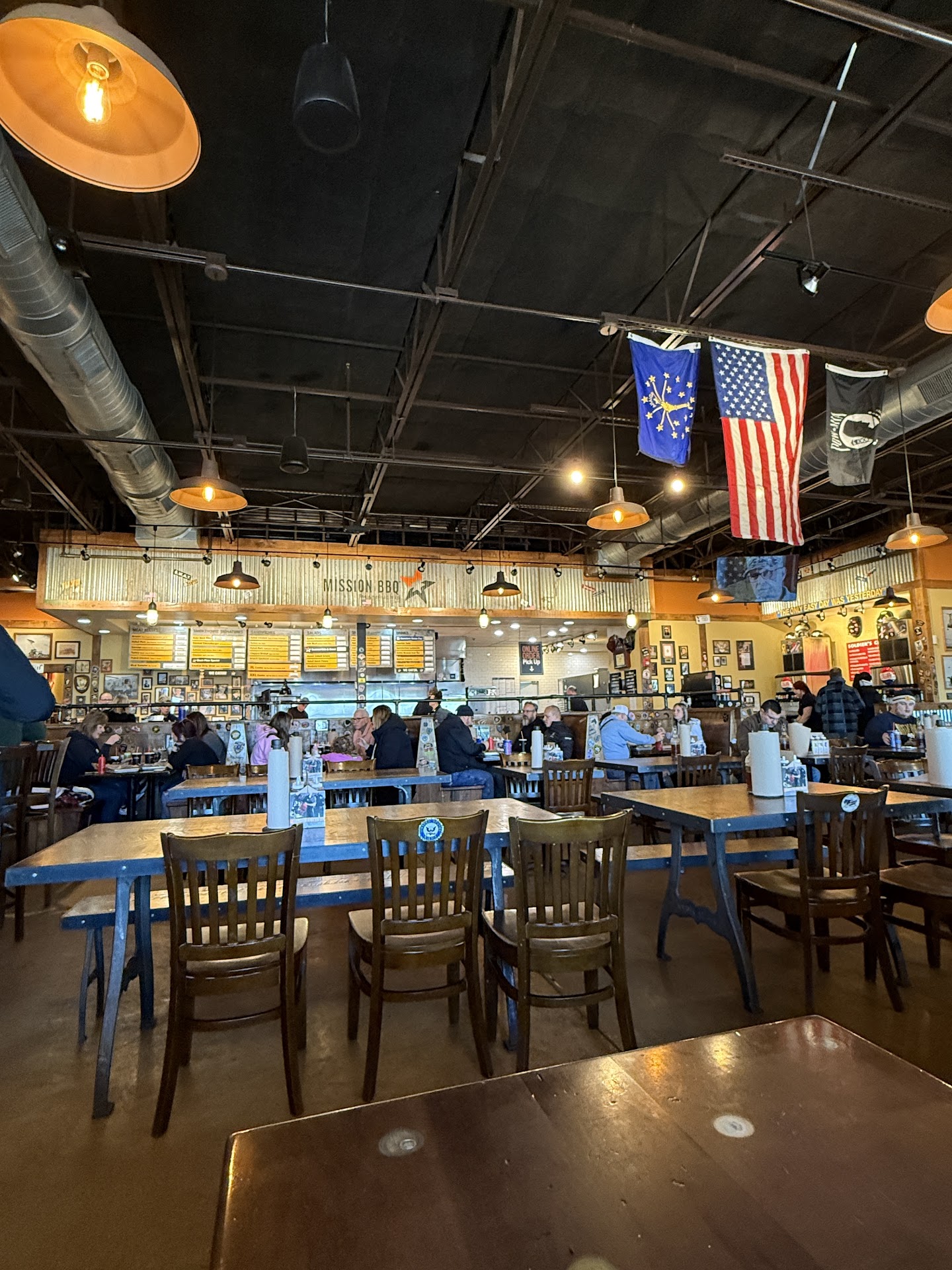 Busy as all get out, but the cashiers were on point. Seating is adequate for normal business, but it was a little crowded for opening week. The kitchen looks very clean and well kept, and shiny stainless everywhere. There were a ton of people on the hot line and we got our food before we even had a chance to get our drinks. Two drink fountains as well as tea and lemonade made quick work of getting a tasty beverage. The condiment area is unique in that it is a medium sized Craftsman tool box. Inside the drawers you will find drink lids, straws, ketchup, mustard, sauces, etc. It was neat, but I am not sure how well kept you will be able to keep it. Seating is comfortable and they have a few picnic tables outside as well. The decor celebrates our countries military history and the men and women who serve. Nice collection of photographs, uniform patches, etc. There is some of the corrugated tin wanes coating on the walls, but not over done like some places I have seen. There are a few televisions spread around the room, but this is not a sports bar so it is not overwhelming. The really neat thing is every day at 12:00 noon, everyone stops, stands and sing the national anthem. It is a nice touch to honor our country. Well done! The food was well proportioned, and the temperature was good. I had the pulled chicken sandwich with a side of mac and cheese. The chicken was well smoked, but not dry. It had a great flavor. There are six sauces sitting at each table with a variety of bases and flavors from a honey with heat to a mustard based sauce. Great sauces, and they only added to the flavor. There are other sauces available, like a Alabama White Sauce that is really pretty good. The mac and cheese was really good. Good thick cheese sauce with some bread crumbs on top. I could have gone for a larger portion, but it satisfied. One of the workers brought around some Freedom Fries (seasoned French fries) as a sample and they were well cooked and seasoned. They went great with the white sauce. The sandwich combo with a drink and one side ran about $10, so it is a bit higher than a fast food meal, but I feel worth it for good BBQ. It is not going to be an everyday option, but something as a nice treat. Overall, I think Mission BBQ will be a welcome addition to the several other BBQ places in the area, and one of the better ones that...