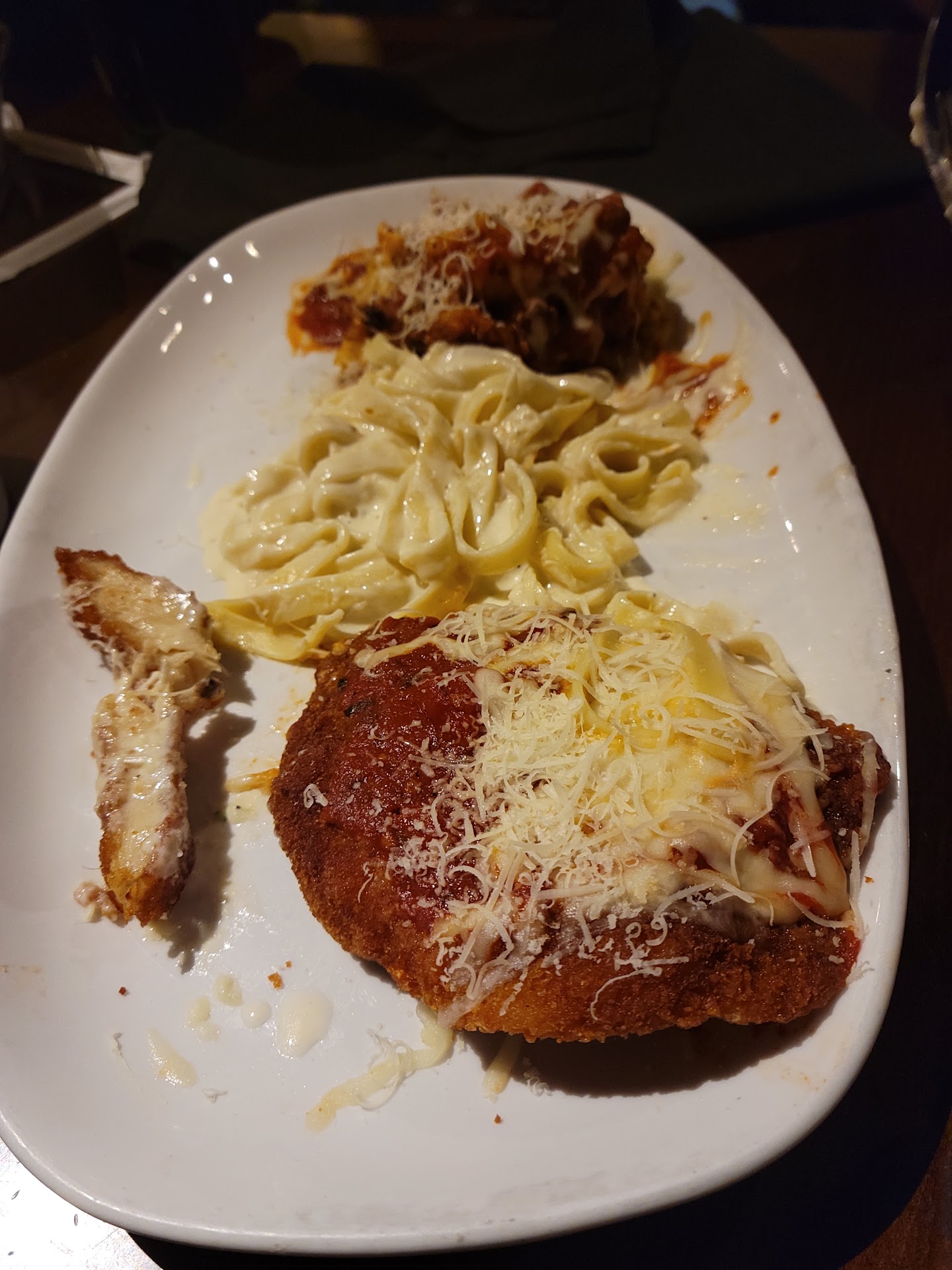 Chicken Alfredo with Broccoli added is my dish of choice. Well, the grilled chicken was rubbery, and I don't mean the usual cooked chicken texture that I've come to enjoy from olive garden. It was overcooked. I did get it replaced with the Fritta style chicken and was much happier with the chicken, but by the time this all came to an end, I'd eaten my soup, most of the breadsticks and just had to Box up my meal which was disappointing. My Alfredo was watery because my noodles weren't drained all the way, so it completely threw off the texture of my dish, and the sauce just pooled around the bottom of the dish under the noodles. My partners Tour of Italy came out looking like somebody had already tried to dig in, which was a first for me because I've seen many Tours of Italy come out pristine. And he had a crispy piece of chicken on his plate, which was odd, but if I throw a fit over that, I'm just nitpicking. That won't lose your points. Sometimes, the presentation gets messy. The temperature of the food was a huge disappointment, I'm used to Olive Gardens Dishes being nice and hot, giving you a few minutes to socialize while they cool in front of you. This was not the case at this location, it was finger warm warm enough to see notice a temperature difference but you can't convince me that this had just been prepared or even thrown in a microwave to at least bring it back up to temp. I love Olive Garden, and the Chain will always have my business as I've been going to them since I was 12 years old, 11 years later and I still haven't found a better, or more consistent place to get my Alfredo and Tiramisu for date nights and social events. But this location will be hard pressed to get me to return, which is disappointing. Please do better and work on your consistency...