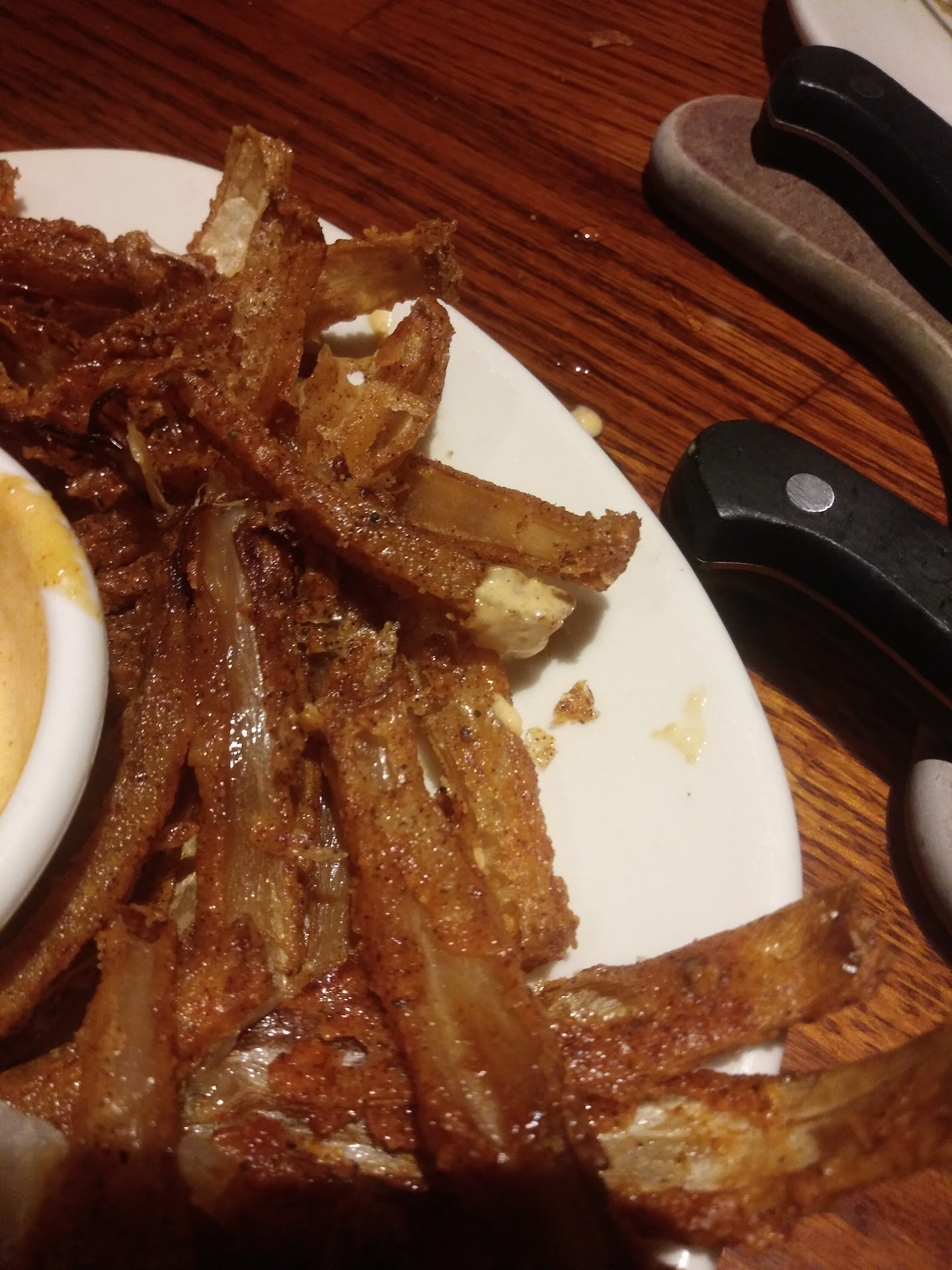 He did not lie about that, the food was brought out by the manager to the wrong table. The manager also expressed that they were out of ketchup, how do you get to that point? Anyways, the waiter( even if very slow was the one bright spot) informed us that the manager had given the food to the wrong table. And that we would get the next blooming onion.