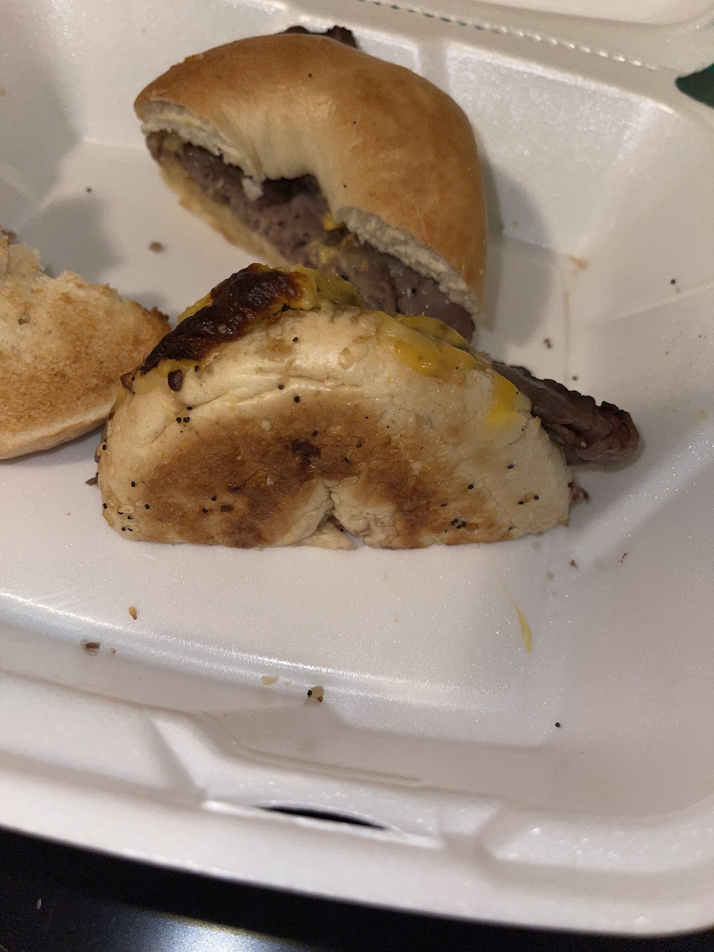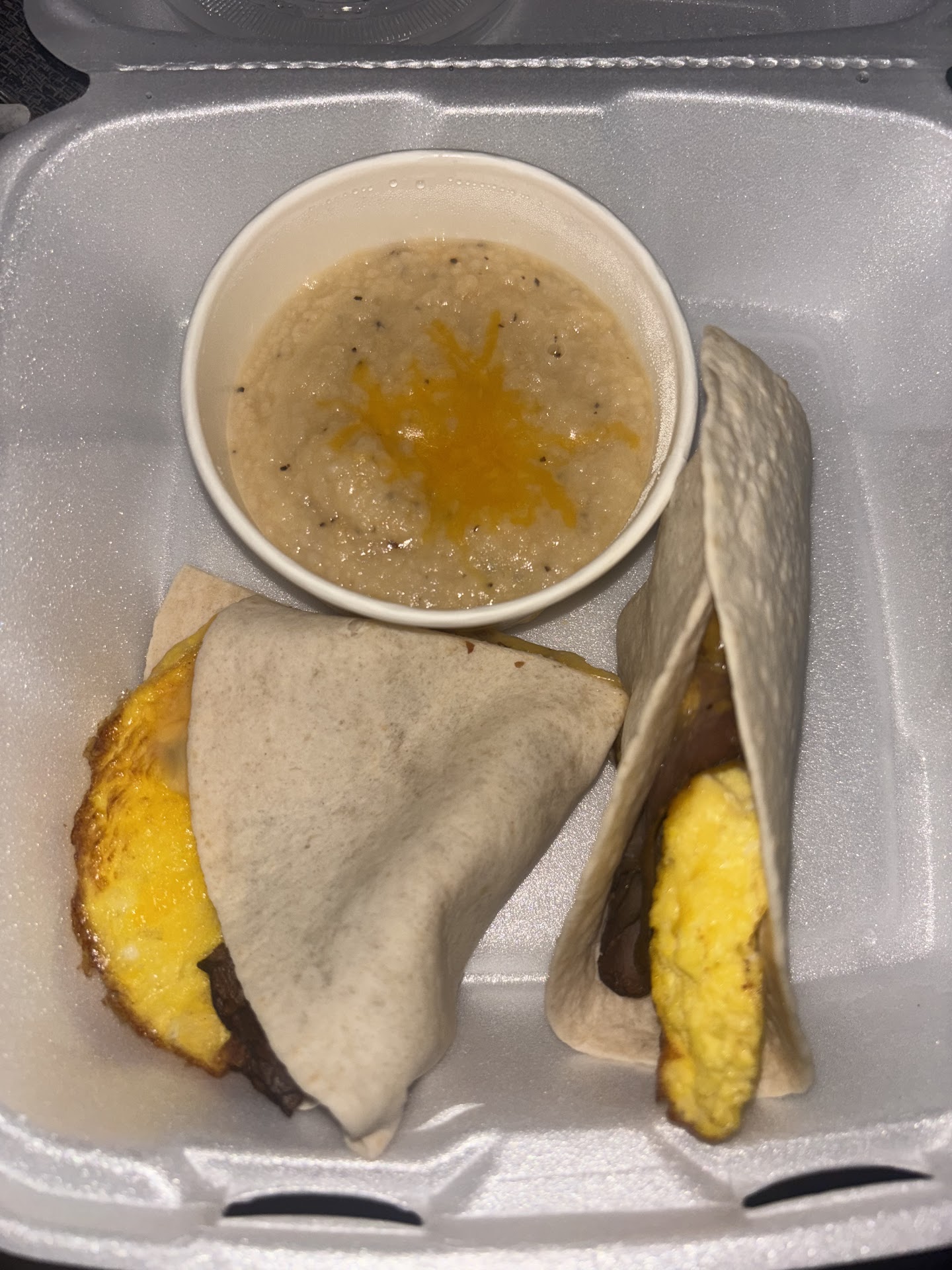 Being a southern girl I enjoyed the grits so much I couldn’t wait to get some more on Monday. Monday I called in my order so maybe they’d get it right this time. I ordered the iced turtle latte, grits and sausage and cheese on a plain bagel. I get there and pay my $22. (Imo not cheap for breakfast for one) I decide to check my order before I leave and my sausage and cheese is on a everything bagel, which I can’t eat because I’m allergic to sesame seeds. I tell her and she takes it in the back and comes back and says “easy fix”. I say thank you and leave. I go home and eat my grits and drink my latte and when I open the box I see why it was an “easy fix”…. She only switched the top of my bagel 🤦🏾♀️ the bottom is still an everything bagel… and there’s also steak on my bagel!?? Huh?