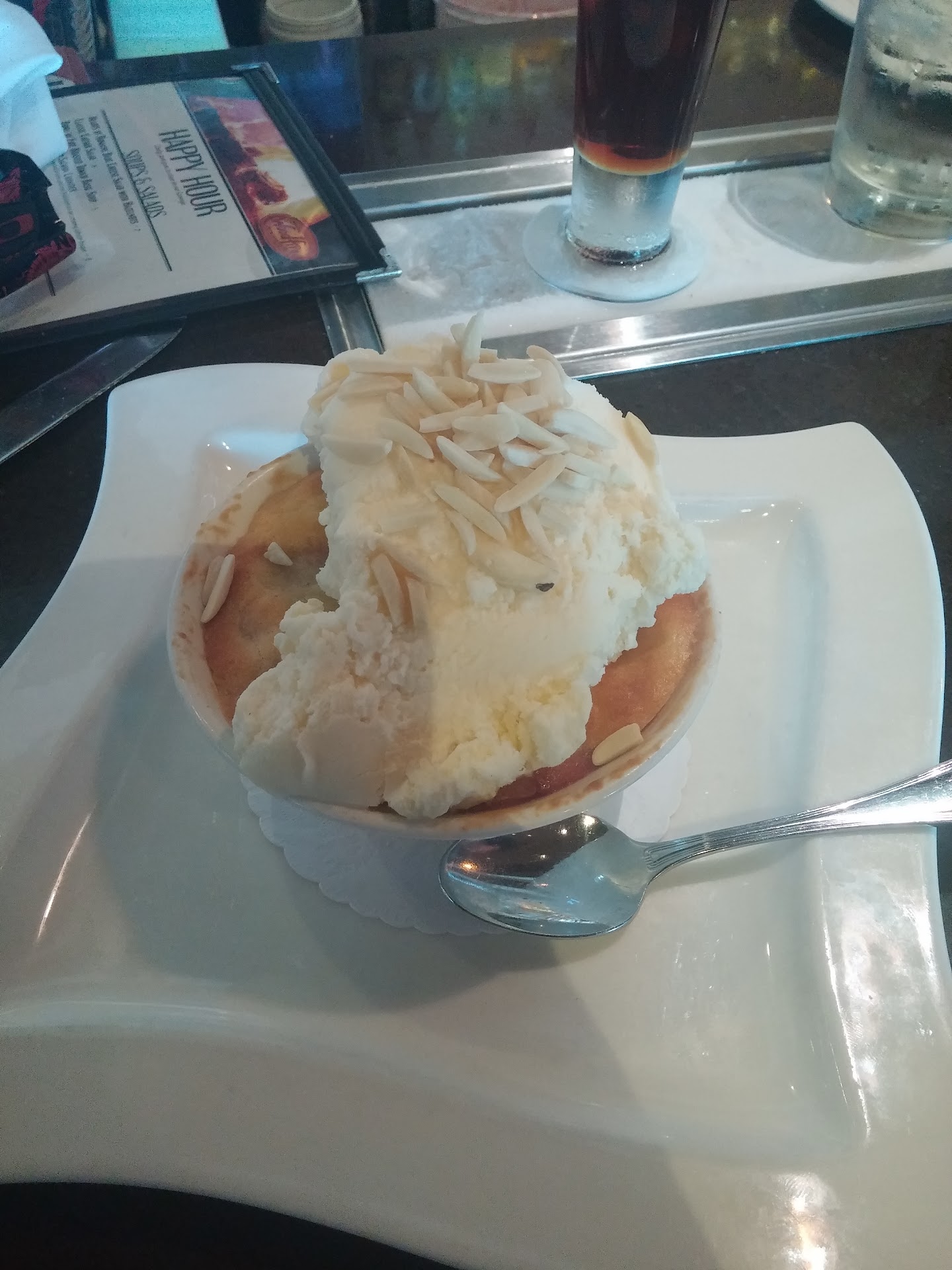 it was not all bad, the salad was good, and the dessert was small but tasty, but most desserts are hard to rate bad. the bread was good, but not cut anywhere near through, so you had to rip it up to get a piece. this is great if you are eating alone, but after you rip it up to get a piece, you have to offer some to others at the table. we were at the table for at least 15 minutes, we had ordered our drinks, then ordered our dinner, then we had to flag the waitress down and ask if we could have some bread.