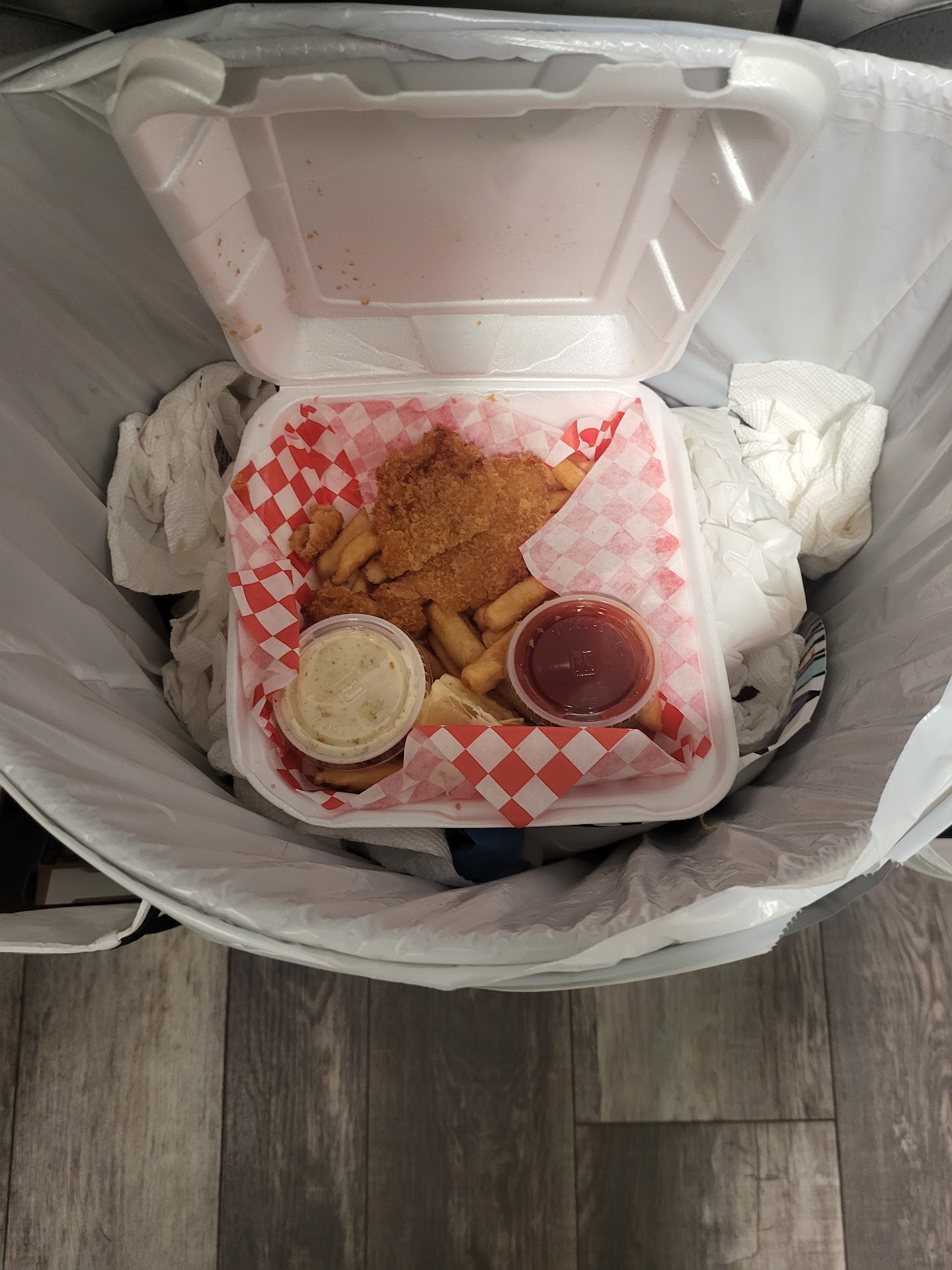I finally arrive home! To my dismay, I find that my fish is nothing but a tiny slice of dry, over-cooked fish covered in an inch of breading, surrounded by a marriad of soft potatoe slices (I wouldn't call them fries.)