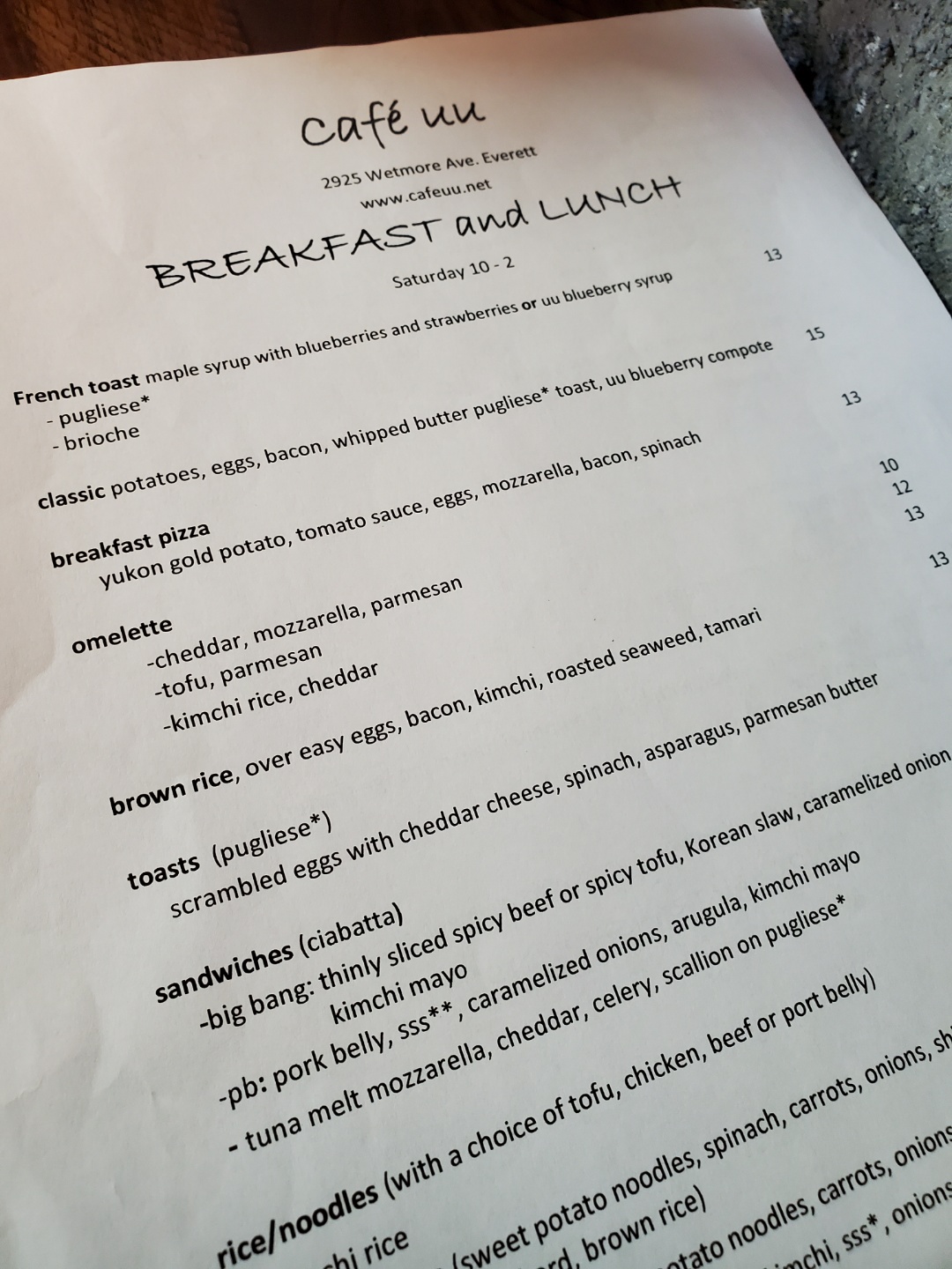 Read moreI brought my mom and niece to the opening night for Cafe uu and we had the place to ourselves. The interior is modern and warm, with lots of really interesting lighting touches. Staff was very friendly and the service was good. Cafe uu's food is best described as Korean-inspired. Standard Korean fare - savory pancakes (jeon), bbq short ribs (kalbi), and rice rolls (kimbap) make an appearance, but it neither bills itself as, nor serves purely traditional Korean food. We ordered the kimchi jeon and three servings of kalbi ssam (lettuce wraps). The food was very good - the jeon excellent. If the kalbi meat was not the highest quality I've ever had, it was also not the worst. The variety of lettuce and other vegetables served as accompaniments for the ssam was great, though it wasn't quite what I expected from the description "banchan," as I've definitely never been served banchan that didn't include kimchi. The ssam is a LOT of food - you're definitely getting value for the ~ $25/person - and serving it with soup is a nice touch, though the staff seemed a little overwhelmed to realize not all of the food would fit on our 4-top. Overall, Cafe uu is a nice addition to the food options in downtown Everett. I'll definitely be back to try their rice and...