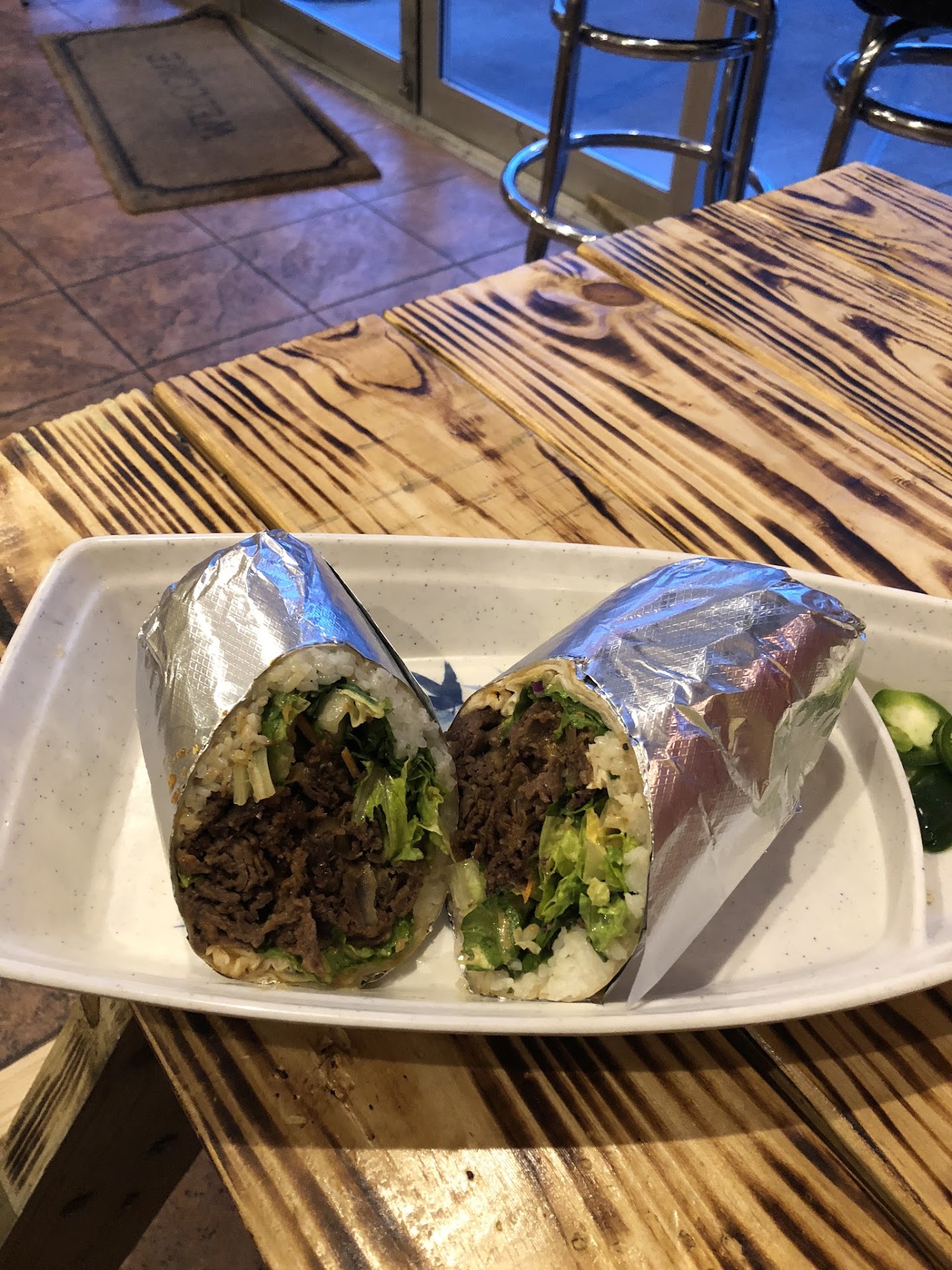 Read moreIm back!!!! Sorry guys ive been mia for a bit been busy with work and haven't had much going out time i know especially now that indoor dining is back. Well I'm Everett today and stopped by this korean burrito spot that was suggested to me by a friend and wanted to try it out, first impression walking in was amazing and really liked how clean the placed looked and organize. Loved the wooden benches, since this was my first time here i had to go with the bugogi burrito, i know may sound so basic but u cant go wrong with bulgogi. Now i came in thinking these burritos will be like the Chipotle ones and sort of are. Humongous 😂, but at least they cut these in half as seen in my photos which helps with the mess you get eating a Chipotle one. The tortilla held the ingredients very well no saugyness( dont even know if that's spelled correctly) . Overall place was delicious, beef taste good and the yum yum sauce combination with the greens just made the perfect combo to melt in your mouth. I was filled with half of the burrito but did not want the other half to get cold because saving it for later wouldn't taste the same so now im bloated. Great spot and fair priced. Will try something else whenever i come back up north which...
