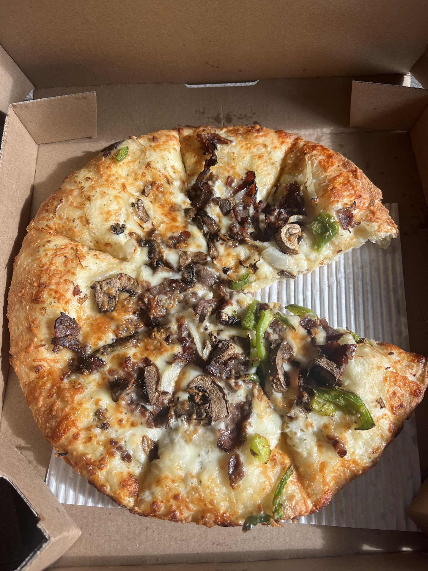 Ā Ā Ā Read moreA while back my family and I had ordered from here , got the pizza for delivery . When it was delivered the pizza had looked like someone turned it upside down as all the toppings were stuck to the top of the box .