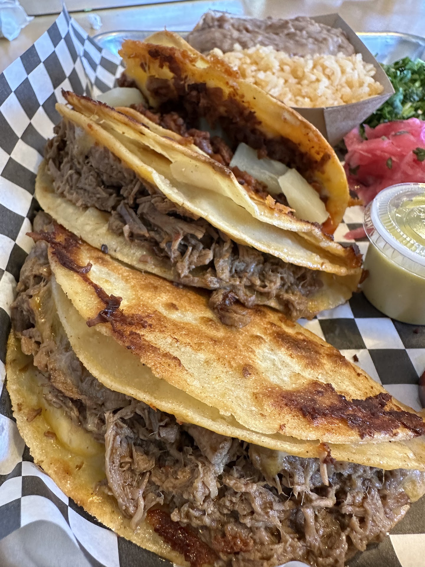 My pictures nor the pictures here do the tacos justice. It's so damn good...especially when that ooey gooey cheese oozes out and and traces the outside of the taco while being grilled and becomes this beautiful crisp. Delish. Yaaaaaas beech....I also want to mention that I hate onions. But I sure ate the hell out of them picked onions. Yum.