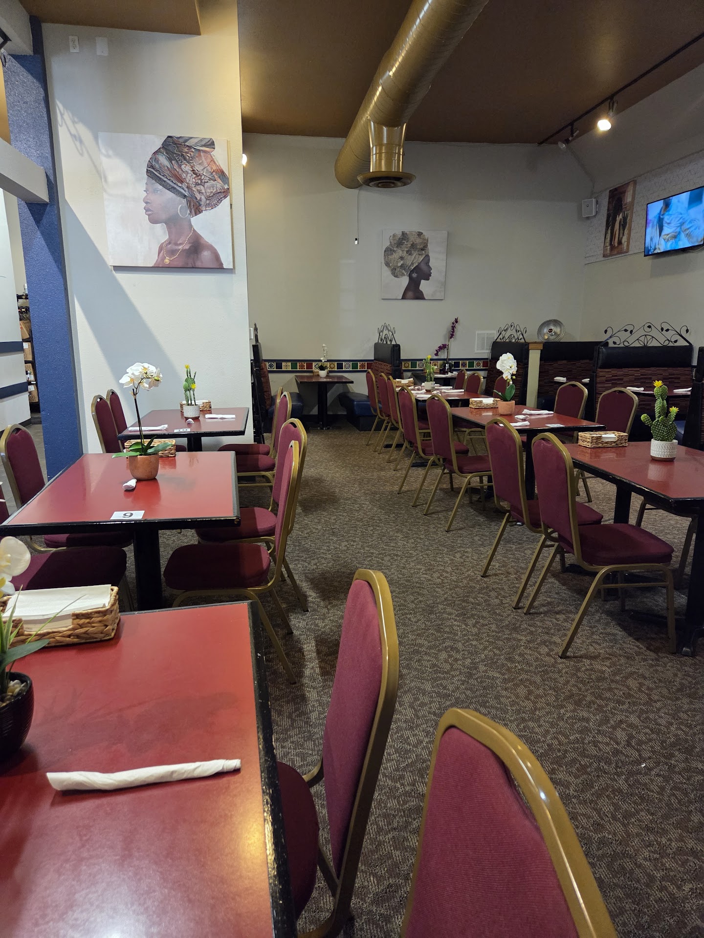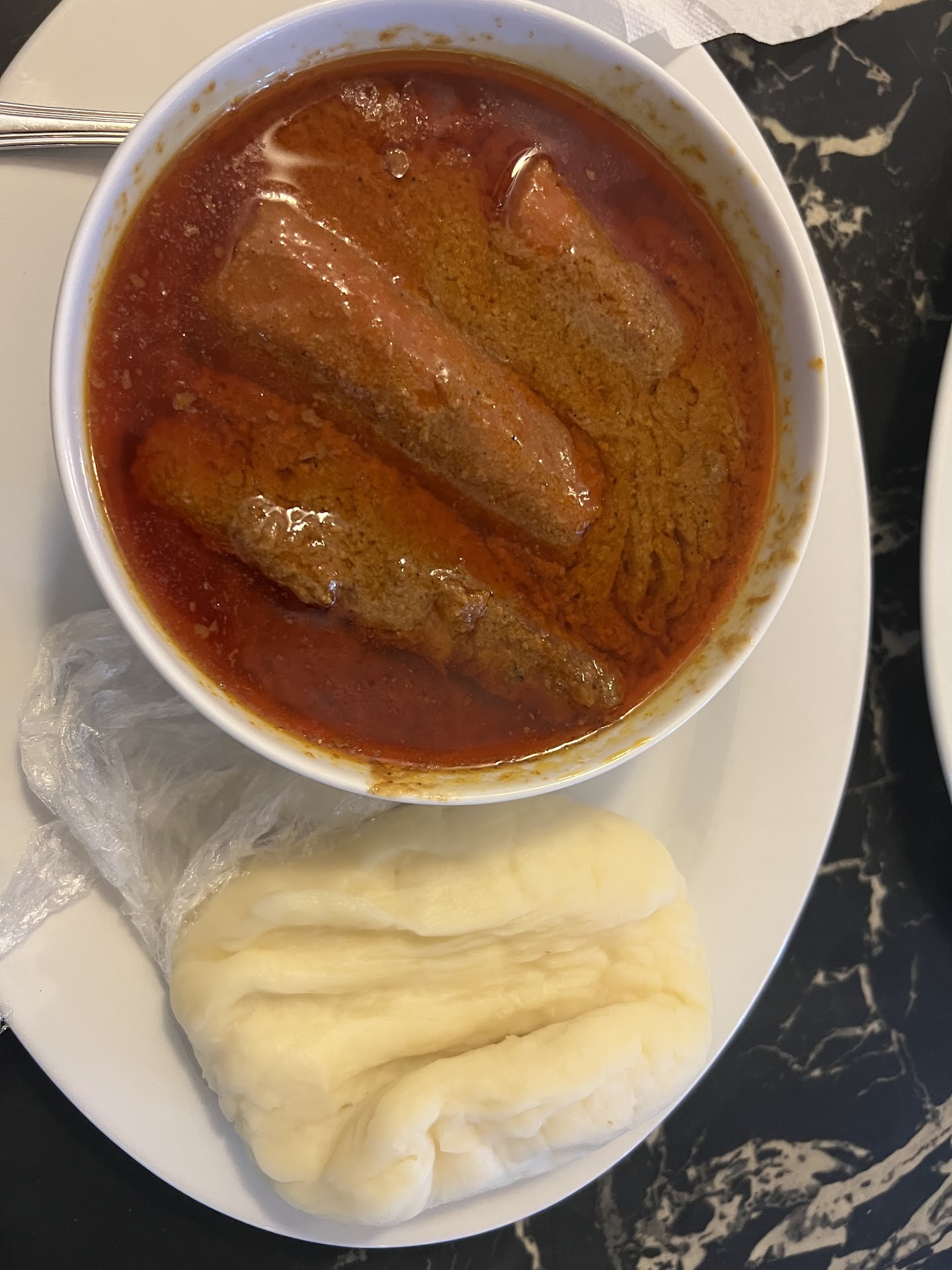 Hi got here not too many people here. I asked for a booth seat and was seated with a menu. Shortly after being seated I was given a glass of water. Okay good so far...two young ladies didn't introduce themselves asked me if more were coming I said no just me and I'm ready to order. I'm guessing they didn't hear me because they were more concerned removing the extra silverware. I asked the young lady furthest away can I place my order? She then pointed to the other young lady busy with the silverware that she would be taking my order and walked away. The other young lady came over and asked me if I was ready. I said yes and gave my order Lamb Dibi Afra with salad with a side of jollof rice and a side of fufu with the pineapple lime ice tea. She left to place my order and came back shortly with the ice tea (pretty good tea). 17 minutes for the food which I was surprised because authentic African food is cooked from scratch maybe I had different expectations. Everything was good but the lamb...it was mostly bone scarcely any meat on the many bones. Tasted good though but not much to enjoy. Also as I was only here 20 minutes it's probably not polite to ask how's the food and try to give me my check so soon. I mean no more than 5 people here. Is there a rush to get me out? Finally the jollof rice was timidly spicy but a bit on the oily side. I asked for a to go box as the rice side portion was rather large could probably feed 3 for a side and I put some of the boney lamb in there as well along with the fufu...I mean I'm paying for it I'm going to finish it!