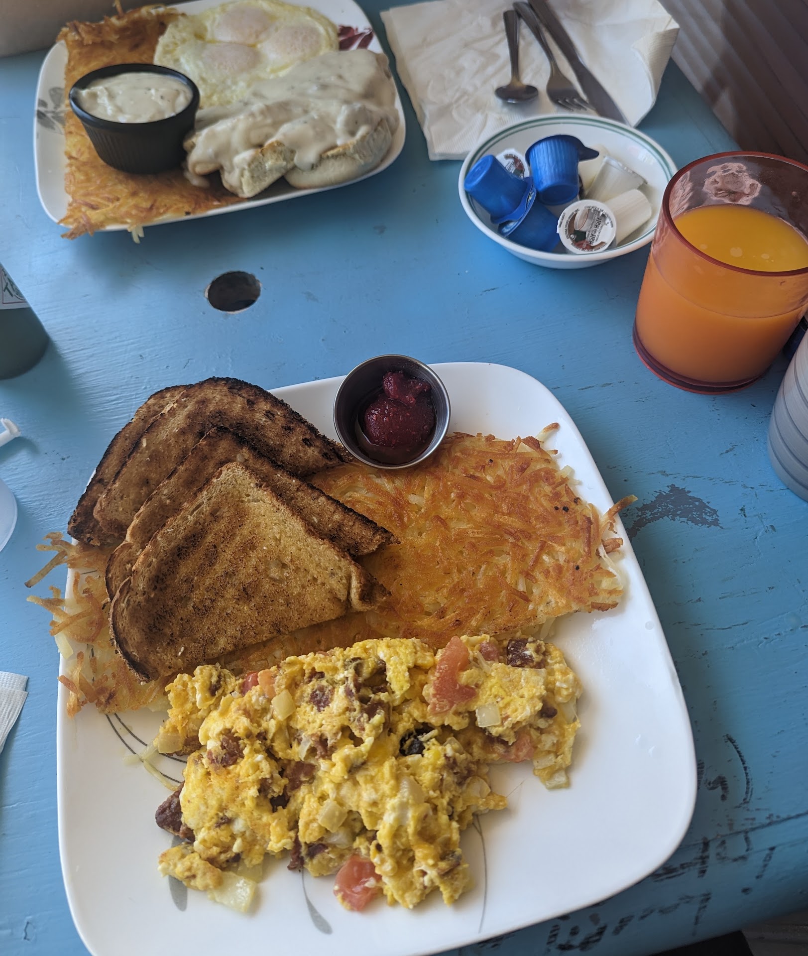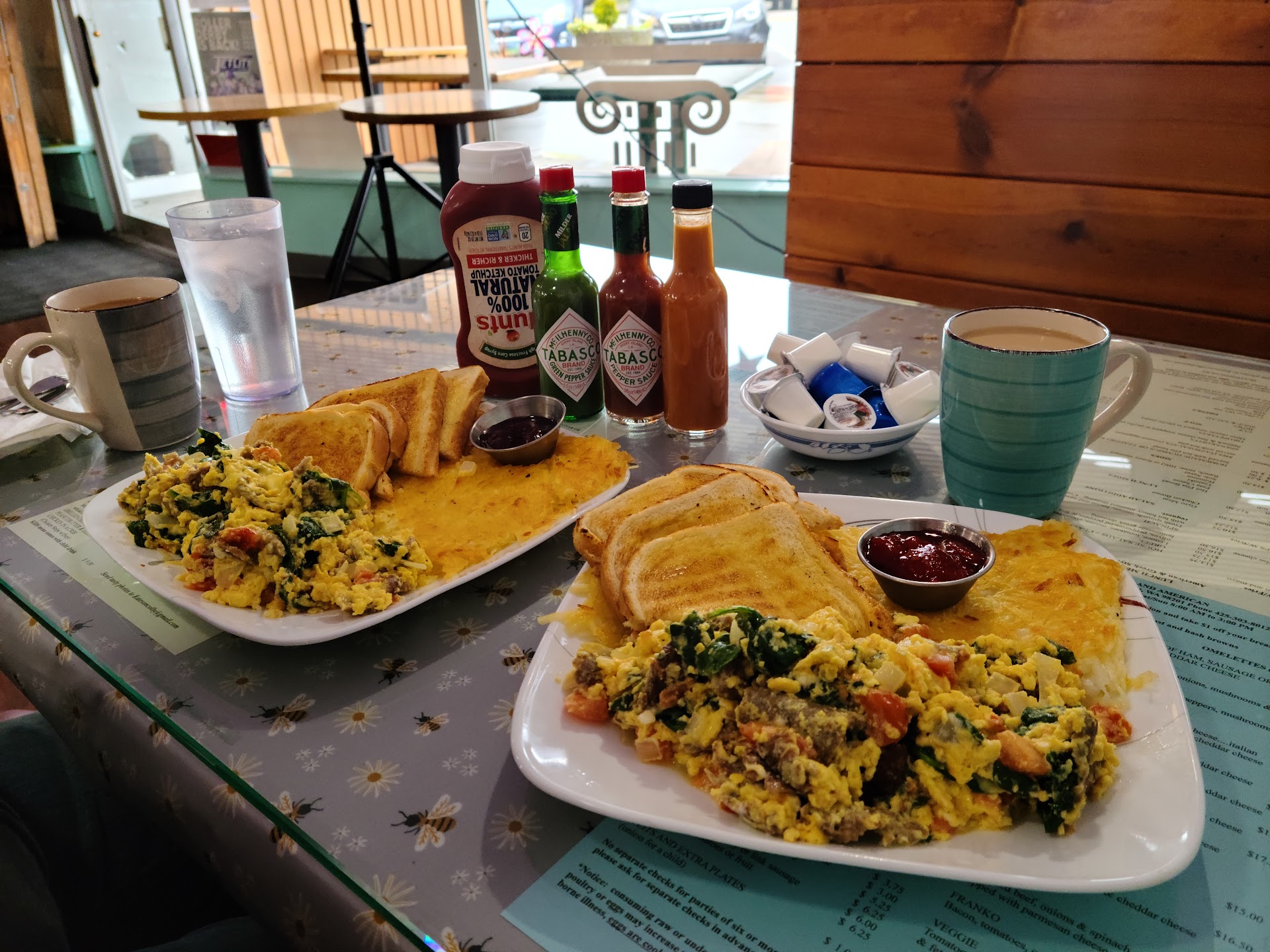 The atmosphere is a bit odd- not as lived in as I would assume for an established diner, but they did have some neat local art on the wall. More than anything, they were all friendly. We will...