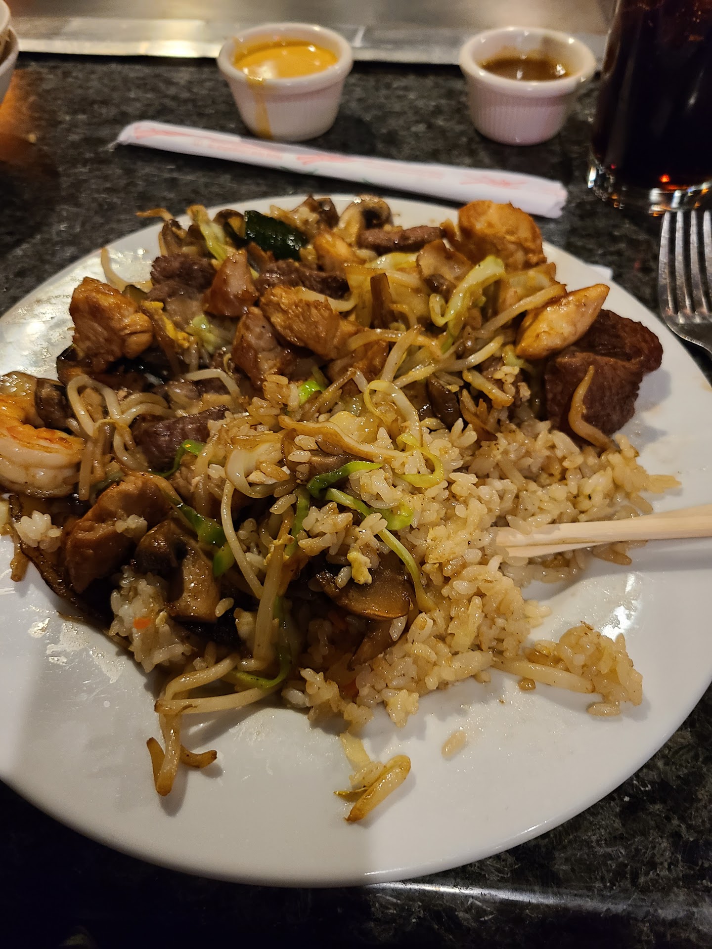 Mains: Steak + Chicken dinner @ $29. Steak + Shrimp dinner @ $30. 2 Fried rice @ $3.50 each 1 Soda @ ? Tax - ? Total - $77 before tip