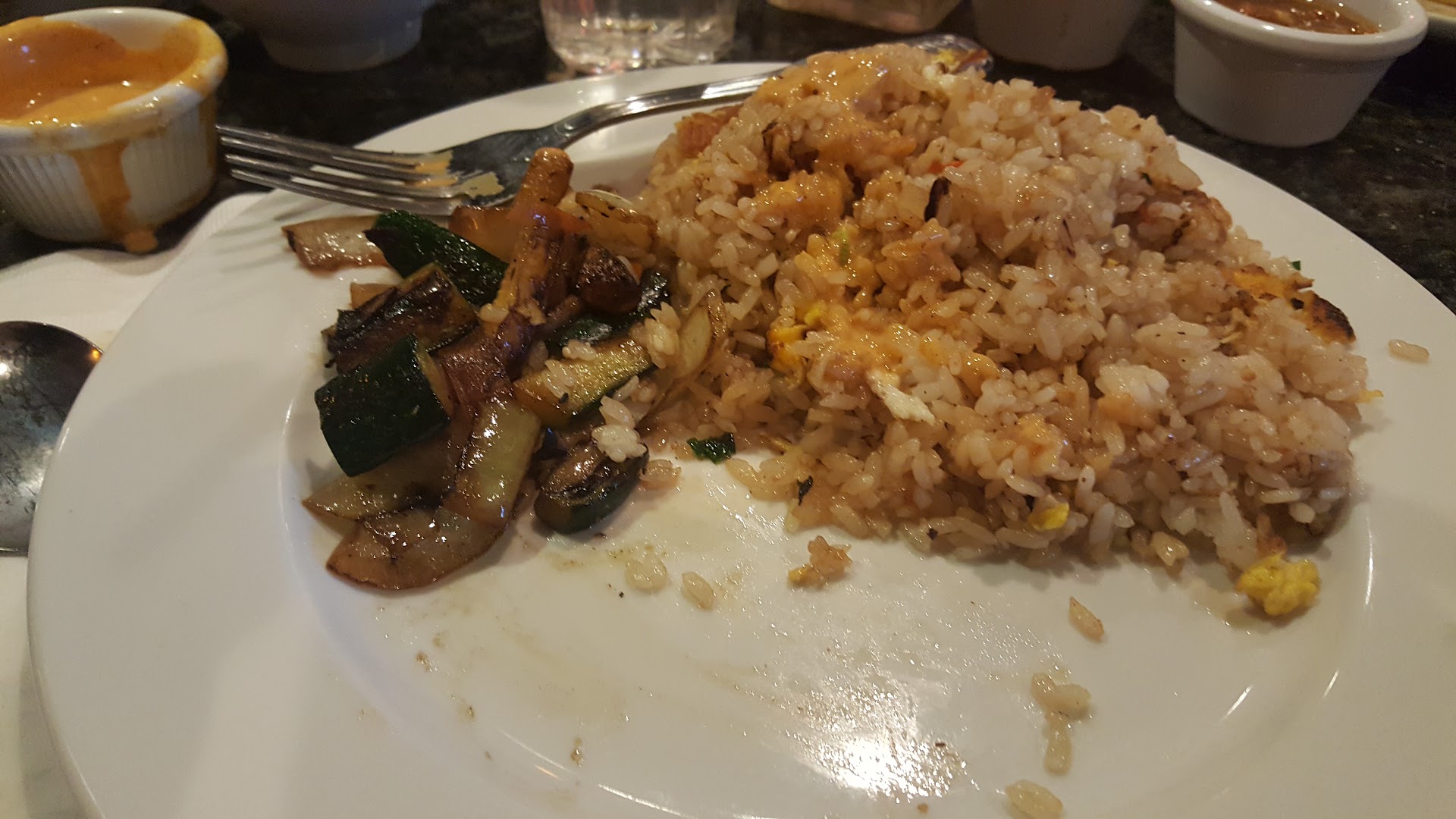 Fried Rice & Veggies: They don’t use garlic in their fried rice / veggies, like others do, and it causes the rice to taste a bit 1-dimensional. The veggies only consisted of onion, mushroom, and zucchini—although they did serve cabbage and bean sprouts at the end. Other places include carrots, celery, and sometimes potatoes along with the onion, zucchini, and mushroom.