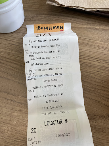 Read moreService very slow most of the time. Staff courteous, friendly and helpful with computer usage if one chooses to utilize that method of ordering. For small orders, one shouldn't have to wait for larger orders to be completed. Drive through should have a passing lane on the right for those who need to escape the long line wait in drive through, especially when you are only ordering one beverage. Door exit from the building on drive through side of building extremely dangerous for pedestrians leaving the building there. Bathrooms very nice and clean. Nice and comfortable seating arrangement. Your coffee cups leak at the seams and cannot be microwaved. This particular store on route 99 in Everett, Massachusetts very cheap with the napkins. When you ask for napkins you are lucky to get two of the lowest quality napkins with no absorption ability for all that dripping coffee from defective coffee cups and melting ice cream cones. Finally, entering and exiting the parking lot to order and leave quite awkward having to circle the building twice. Also, backing out of parking spots including handicap spots next to building dangerous especially when people entering the lot to order come whipping around the corner to order food to satiate their voracious appetites. Hoping some improvements will be made when the Wynn Casino/Hotel is completed. ...