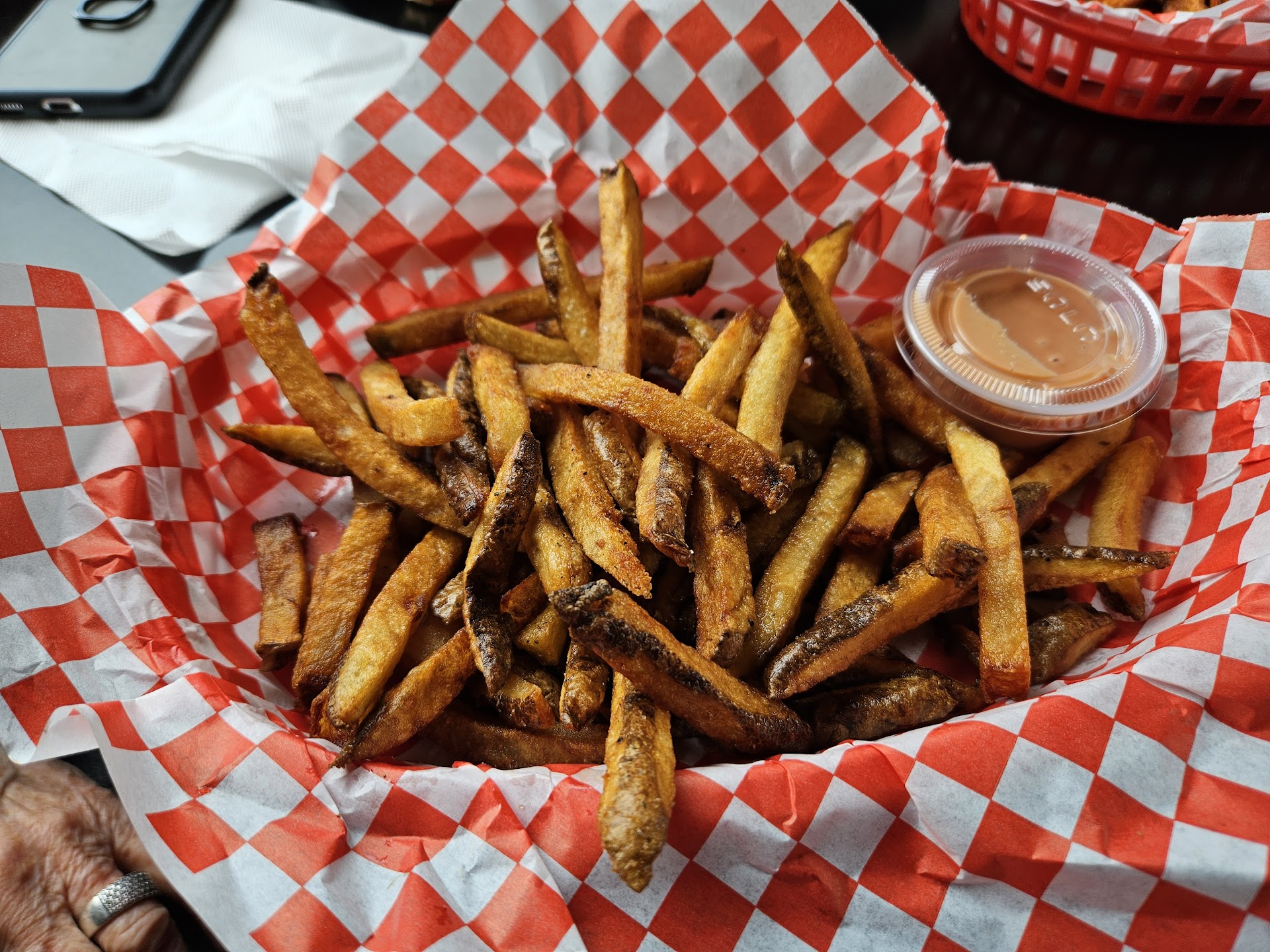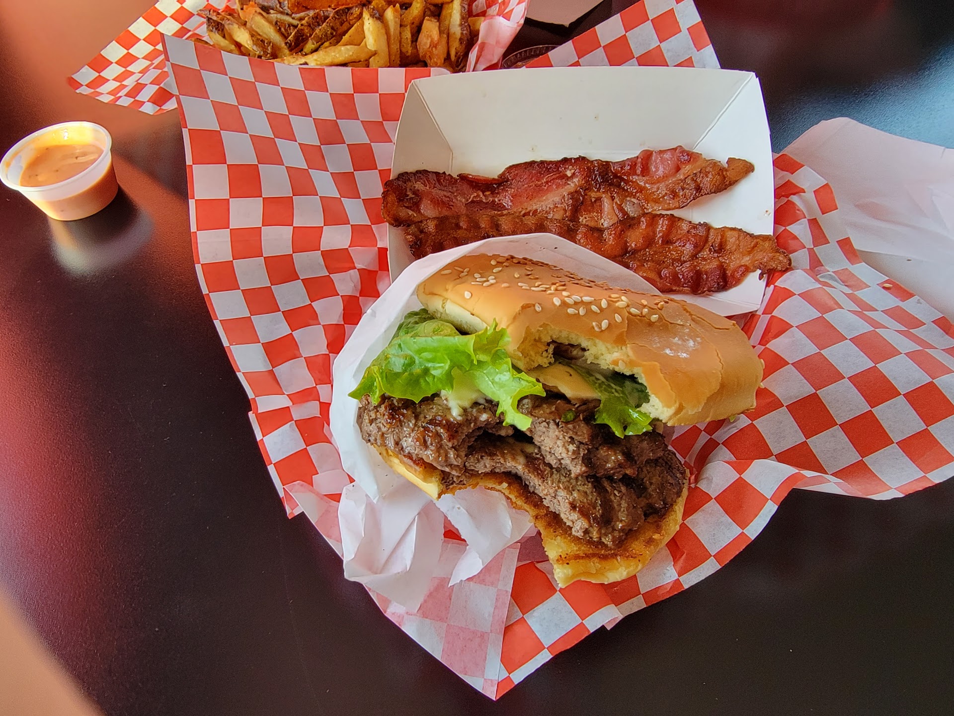 Now the foodâWOW. Hands down one of the best burgers Iâve ever had. Juicy, flavorful, perfectly cooked, and stacked with fresh toppings on a soft, buttery bun. Every bite was better than the last. The fries were crispy perfection, my 1 year old devoured them!