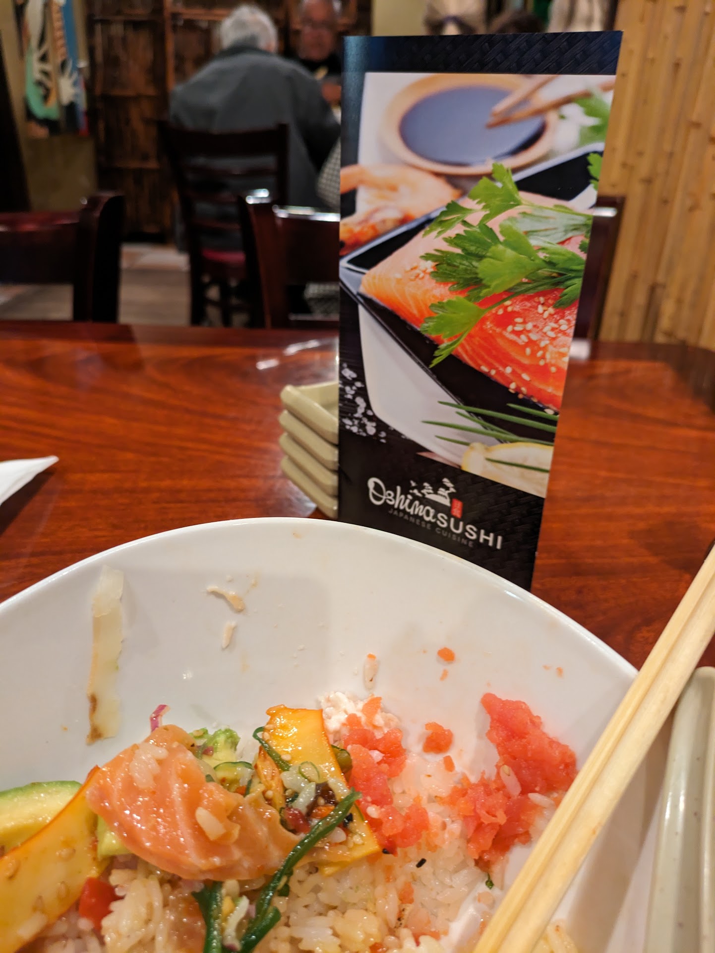 Service was absolutely stellar. I had lots and lots of questions and I think all of the weight staff stopped by to answer my questions for me and I ended up getting the pokeball and I am really delighted with it. They explained to me they've got several different kind of sesame bowls and I like the pokey bowl. It has a really nice sauce to it and there were just tons of food in here just and very delightfully presented. I did ask for the lettuce instead of rice and they said it would be an upcharge of $2 which I didn't want to go for. But that would have been a nice addition if they would have been that the atmosphere was a lively there all lots of tables were full. There's a sports bar football game on right now. Music playing in the background. The chefs are busy at the sushi bar. The tea is really great. I definitely know this is one of the places I like to go to. So sorry my husband doesn't want to eat Japanese anymore. This is a real treat We live up in Mount Baker now and it's 100 mi trip to get down to Everett but I was down here today and thankful to come out of my way a little bit to be able...