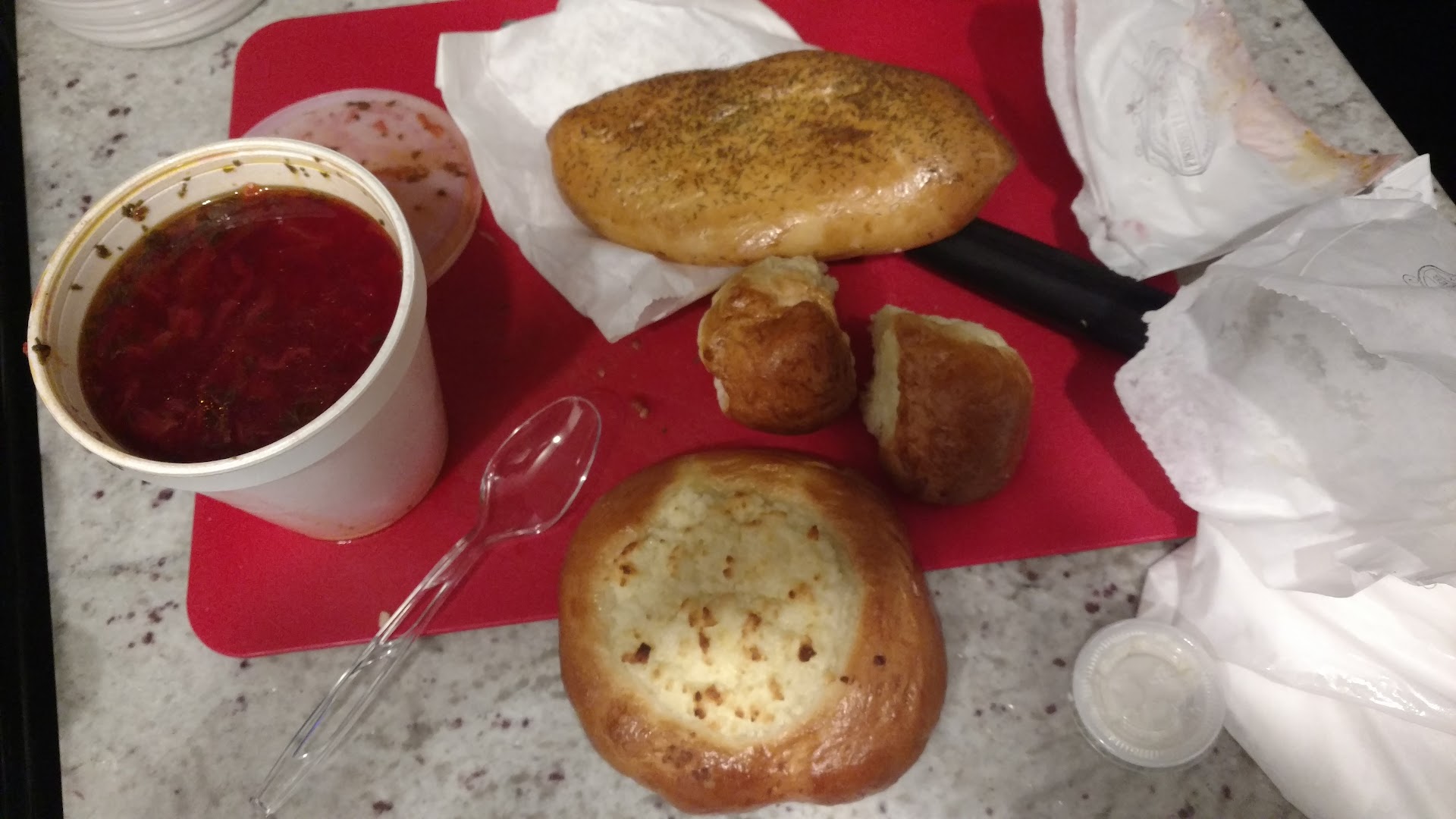 We spent rough $147.00 getting a variety of different things some to stay such as the crepe, piroshky, and hot tea and all of the baked goods and one crepe to go.