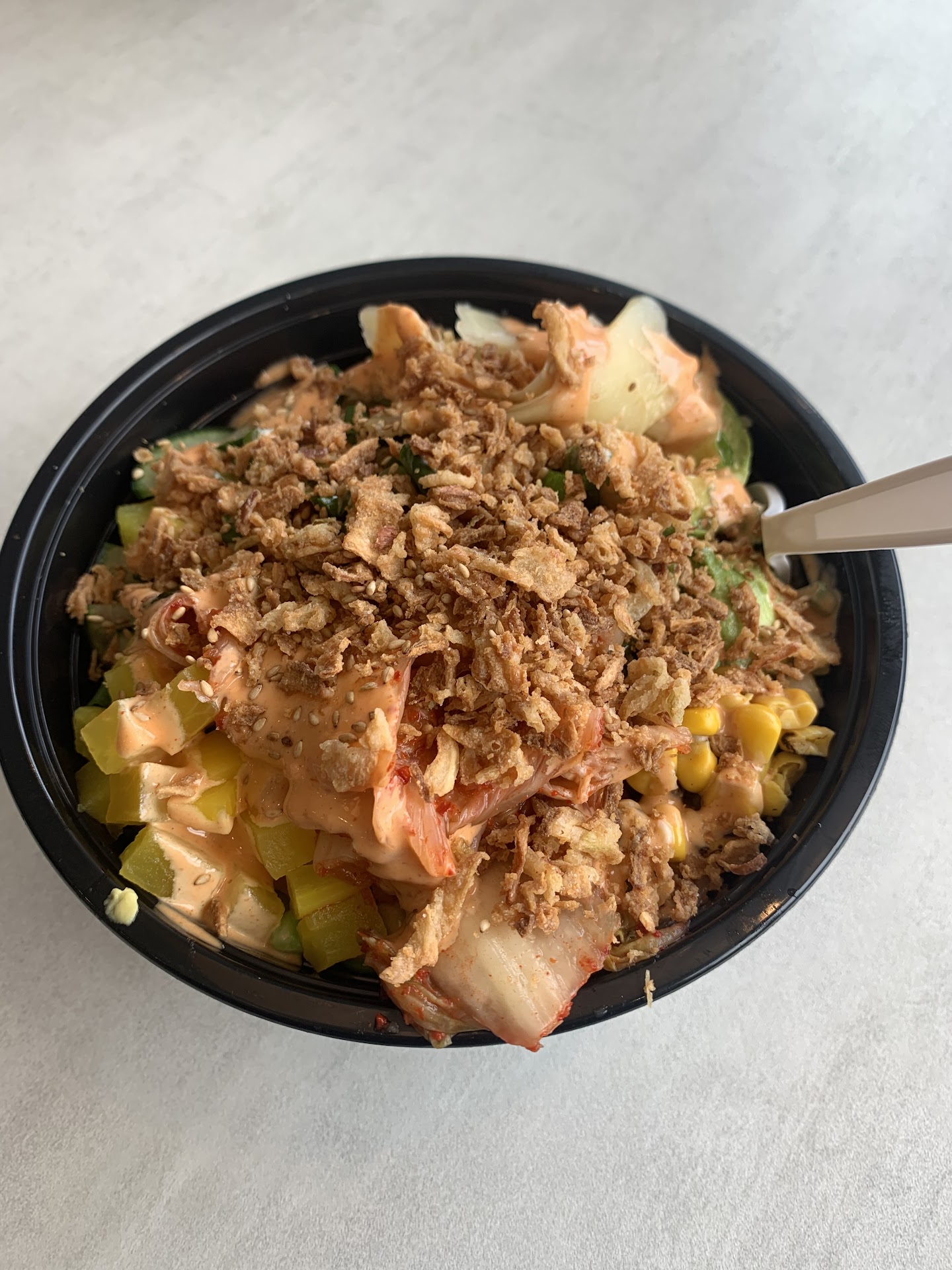 HIGHLIGHTS: -Attentive staff, quick to make eye contact and help me choose my options as I am a fish out of water when it comes to these ‘create your own bowl’ meals. -Sizable and fulfilling portion. -Combination of flavors, textures, and varying densities of the ingredients which add up to a surprisingly tasty meal: -The soft, and lightly seared ahi tuna. -The crunchy and savory fried onions -The fluffy texture from the leafy greens created by replacing 1/2 the rice with Spring Mix lightened the otherwise dense dish.