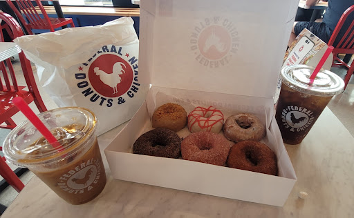 Read more3 5 - 4... Finally got around to checking this place out. So many mixed reviews so I found out for myself. The donuts were good. I like the warm ones that are fresh made that come with the chicken strips. That one was really good. The chocolate covered one was okay. Probably should have just got a glazed. The chicken itself on the chicken strips and on the chicken sandwich I got was good. It was nice and juicy they make it fresh so it's hot. I like the crispy outside. Chicken sandwich again was good not run out and have to get it all the time good but it was good. Service was outstanding. Very welcoming very warm giving good advice as to what we should get since it was our first time there. Inside was nice a whole bunch of tables very clean. One big positive is the coffee. Very good coffee comparable to some of...