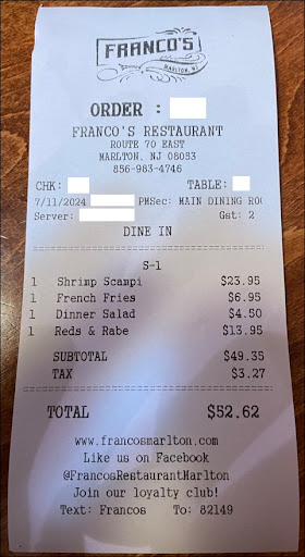 Read moreThis was our 5th and last time eating here. We've always had good experiences and the food has always been tasty. Fortunately tonight was a completely different experience. It's been about three to four months since we've eaten at Franco's and things are completely different. I ordered a chef salad. It comes with garlic bread. Normally the salad is sizable and very tasty. This time the size was still decent even if a little bit smaller than in the past but it was hardly any meat at all. Oh, the garlic bread never arrived. My son order two slices of pepperoni pizza. The waitress came back to the table to let us know that they only had one slice available and that they could make us a personal Pizza if we would like to pay for that. Knowing that the personal Pizza is tiny we opted to purchase a large pizza instead. Big mistake, what arrived is what I would consider a large small to a medium. You'll see by the photo that it only takes up about 60 to 70% of the tray. This by the way cost $20 for the pizza. Tiny but still tasty. We also ordered pizza fries. Unfortunately, like the garlic bread, it never arrived. When we are done eating the waitress then asked if we'd still like our pizza fries and garlic bread. Obviously the answer is no. While we were there there was a pickup order that was having problems with payment and somebody called that has a delivery order and obviously received the wrong food. So the problems were only going and not just with us. The waitress was nice enough and the cashier was as well. When he asked how everything was I told him about half our food not arriving and the fact that our large pizza was a medium at best. The only response I got was, oh I'm sorry. Just not good. It's a shame cuz we really used to like it here. We spent $39 for what I consider a small pizza...