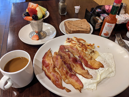 Per typical diner protocol, you choose between potatoes or fruit. I always get both. The potatoes were just right, especially if you prefer to avoid burned pieces (see bacon comments above). The fruit was good, but nothing special. The overflowing metal service connotes old elegance, but an ordinary bowl might be easier to attack.