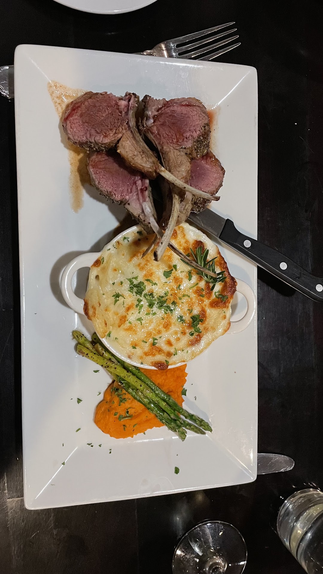 Again, we aren’t fancy and generally aren’t bothered unless your inherent promise isn’t met. Here the setup is really a farm town bistro. For the price, however, a table cloth would generally be expected. Slightly loud rock music was playing over the speakers, songs I liked, but neither the volume nor tunes you would expect at a French style bistro. We picked the lamb special as one of our two dishes. The waiter thought it was $36.50 which sounded suspiciously cheap. When the bill came, it was $54.50. The waiter never acknowledged this change. My wife was never asked how she wanted it cooked, and it came out bloody, which just isn’t how rack of lamb is served. We sent it back for more heat, which is something we haven’t done in probably 15 years. The waiter did ask if my shrimp could be blackened at my request, and they came out nicely done. The young waiter seemed to not know the tradition of tasting the wine, serving women first, adding water to the ice bucket to transfer the cold temperature to the wine, and serving with a cloth to wipe the bottle so I wouldn’t have had to wipe the ice cold water on my pants.