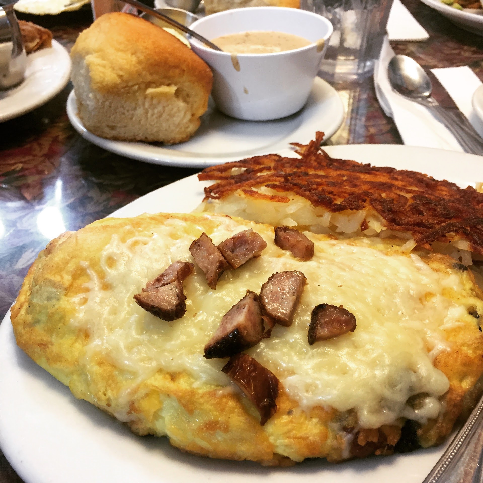 Read moreI was disappointed when I didn’t see eggs benedict on the menu and thought I would just settle for an omlette. I got the railroad with sausage, cheese, green pepper, and onions. It also came with hash browns and a biscuit with gravy on the side and it was A LOT of food! After I took that first bite in the omlette, I was not disappointed anymore. Usually, I feel that omlettes are bland and that’s why I never usually get them, but this one was super fluffy, flavorful, cheesy and delicious! I was really surprised and knew that I need to give omlettes a chance again. The hash browns are really good as well and were cooked so it was crispy on the outside and potato-y on the inside. I didn’t eat the biscuit as it was too much food, but the gravey – OMG – SO GOOD! I ate it on top of my hash browns and couldn’t stop eating even after I was full.