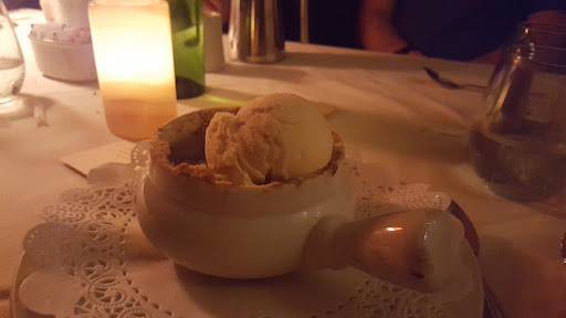 The dessert was also a mixed bag. The apple crisp with vanilla ice cream was delightful, but the tiramisu, although light and topped with a brandy whipped cream, was not flavorful.