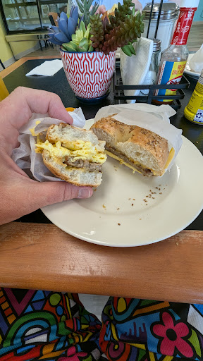 I ordered the Huevos a la mexicana burrito. I asked for NO meat for clarification but they also left out the eggs 🥲 My burrito was still flavorful as it contained beans, cheese, avocado, onions and homefries. The bagels are great. Still fairly new establishment and the girls in the front are still learning so be patient 😊 Overall good experience. Will be back to try...