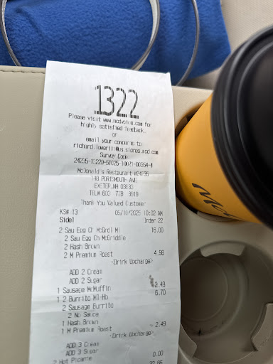 I was unfortunate enough to stop at the Epping NH McDonalds. After the cashier made me repeat myself for every part of my order (ie. I'd like a HOT coffee, with UNSWEETENED pumpkin spice flavor and CREAM, She responds with HOT OR COLD, SWEETENED OR UNSWEETENED, BLACK OR CREAM), we then found she had charged double for coffee and fries. Then I noticed the flavor was not what I had requested so went up to question her only to be told that what I asked for had to be entered as another flavor. I told her the actual flavor was not p.spice. She got a co-worker to give her opinion and this person spoke to me and looked at me like I was from another planet and shrugged her shoulders with a "what more do you want?" attitude. I will never go back to this shop. We then went to the Stratham NH McDonalds to ask their opinion of the explanation I was given. They could not understand where that had come from and were also extremely helpful (unlike Epping). I came out with a proper flavored...
