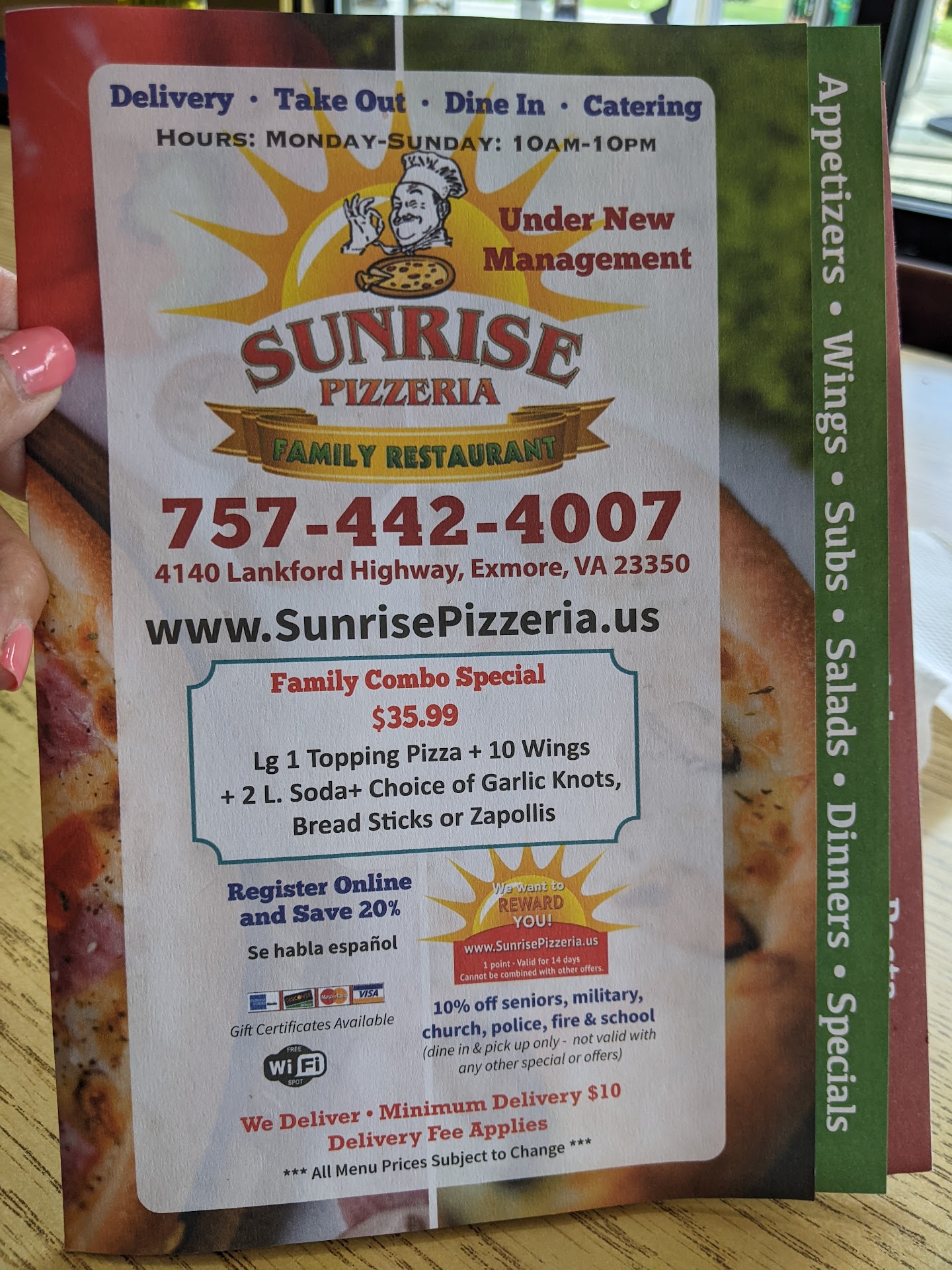 For those who haven't tried the food yet or have but werent satisfied, the pepperonis and sausages and everything are all beef. The owner can't eat pork so he doesn't sell it. Beef pepperonis, beef sausage, turkey bacon, and the ham is probably turkey but COULD be pork (probably not). Also, the gas station part is not the restaurant. They're run by different people and have different employees and seperate management. It's called "sunrise sonoco" because the owner of the pizzeria rents the whole building but only runs the restaurant. The pizza is good there because rather than bland, smeared tomatos, the sauce is a nice, sweet marinara but not so sweet it's like it has had a pound of sugar dumped into it. Its made with sweet tomatoes. The portions on the dinner menu are quite large but that's good for the leftovers (if you're not starving or sharing and just want food for right then, id go for kids menu). The pizza dough is made fresh everyday and then refrigerated to be used that day. They actually have a big standmixer with a giant dough hook and they make a ton of dough that they then spread into square pans, large pans, and medium pans. The soups are made fresh everyday as well. The fish and shrimp are frozen but luckily, we do have fresh crab which is very very good. Never frozen, whenever you order crab cakes, crab balls, stuffed chicken or whatever else, the crab is formed and fried right then. The pizza dough is vegan friendly (of course) and the oil used is canola. The pizza customization is endless. Thin crush, thick crust, light sauce, extra sauce, and tons and tons and tons more. Order takers can even write special requests for you such as "half thin crust, half regular" or "not too much sauce but not light". Sunrise isn't terrible, its just that when stress rises due to 1,000,000 orders at once, it can sometimes get to you just alittle bit but we do strive for customer satisfaction. Also, about the coupon confussion. We dont honor coupons for delivery because we have no way of knowing if you actually have it. Just the other week an employee honored a 20% off coupon for a delivery order but when the food was delivered, they had no coupon. So, we tend to keep that a pickup...
