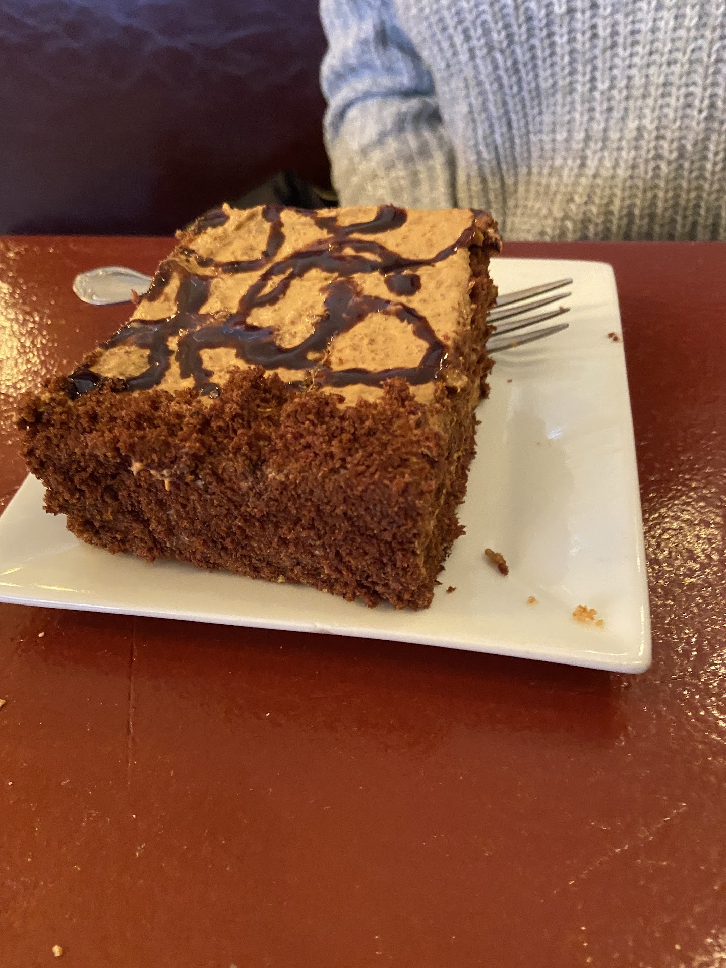 They give you warm complimentary bread with butter to start. We got the Adjarul bread as well, which is the boat shaped bread with egg and cheese. the waitress was so nice and mixed it for us at the table since we never done it before. It cooks the eggs instantly. Reminds me of fondue. The bread is so buttery and melts in your mouth. We got the medium $11 and couldnāt finish it between the both of us. We also got he grape leaf appetizer which we couldnāt finish either but it was really good and packed with meat. I really like the whipped butter on the side. We also got the order of 5 lamb dumplings. They are soup dumplings and warm the soul! Great flavor of the meat and broth and I loved the texture of the dumpling dough. They are big and filling. For dessert we looked at the refrigerator of desserts and the waitress told us about each one. We went with the bird milk cake and a slice of the more chocolate looking cake. Both were very good, square layered cake with creme filling. Both not too sweet and easy to eat. Huge slices. I liked the bird milk cake the best, it had a chocolate frosting type thing on the top. I also got churchkhela which they make there too and from grapes. It looks like a fruit roll up and has walnuts and nuts in it.