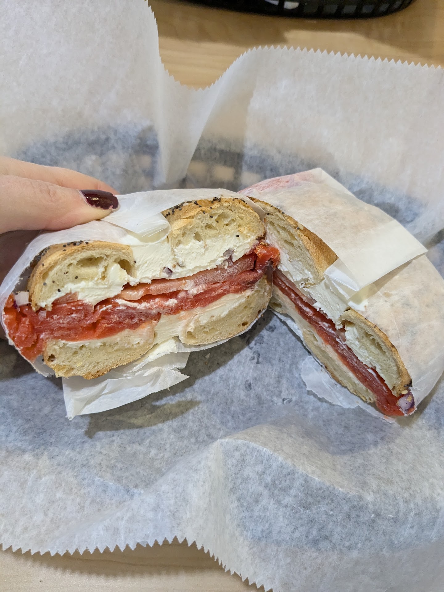 The bagel sandwich was a excellent.ots of peppers (green and red), red onion, nicely cooked bacon, 1 egg, and a good amount of cheese (pepper jack iirc).