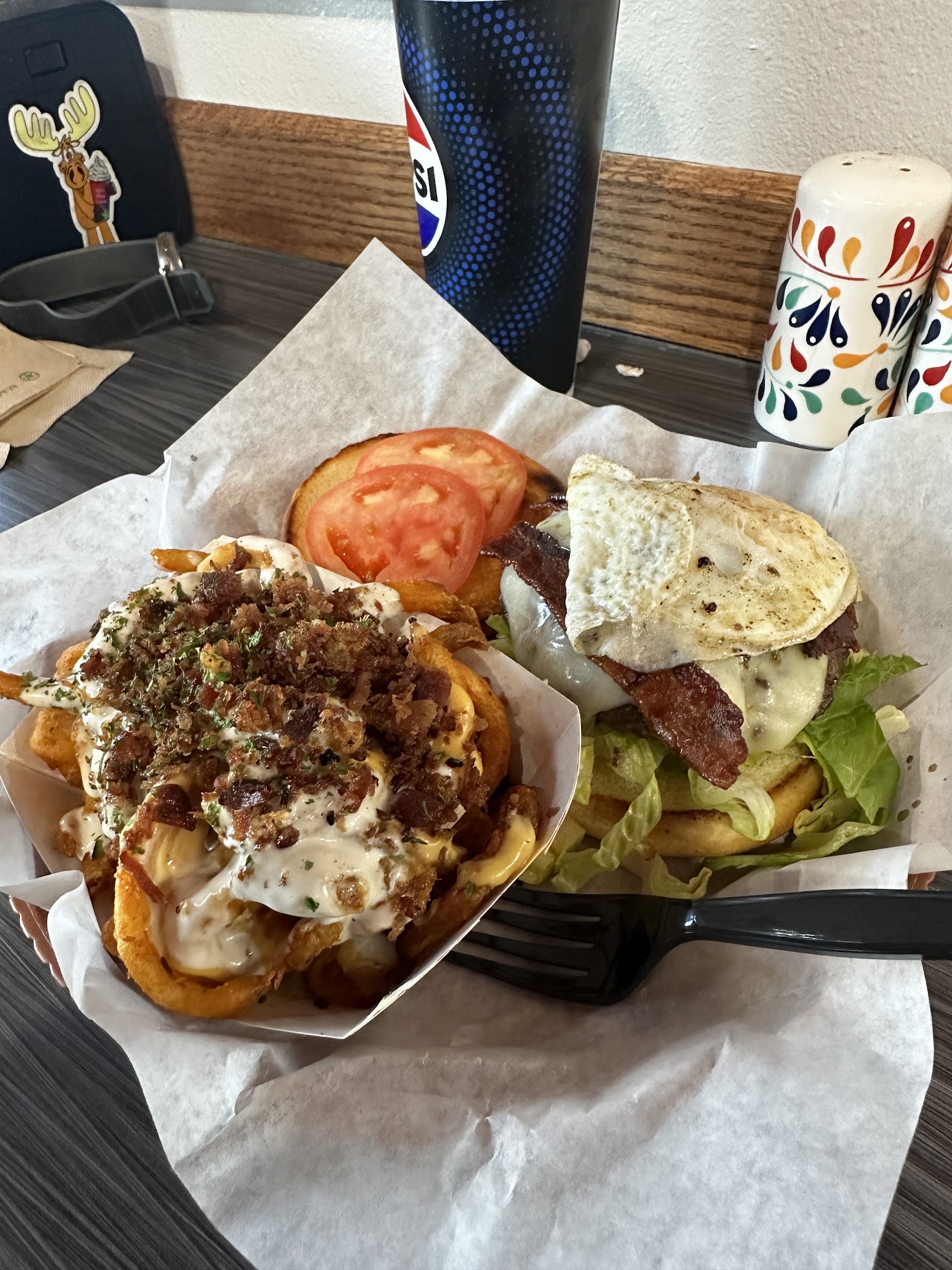Decided on the sunshine burger, with the bacon cheesy ranch curly fries and a cherry Pepsi.